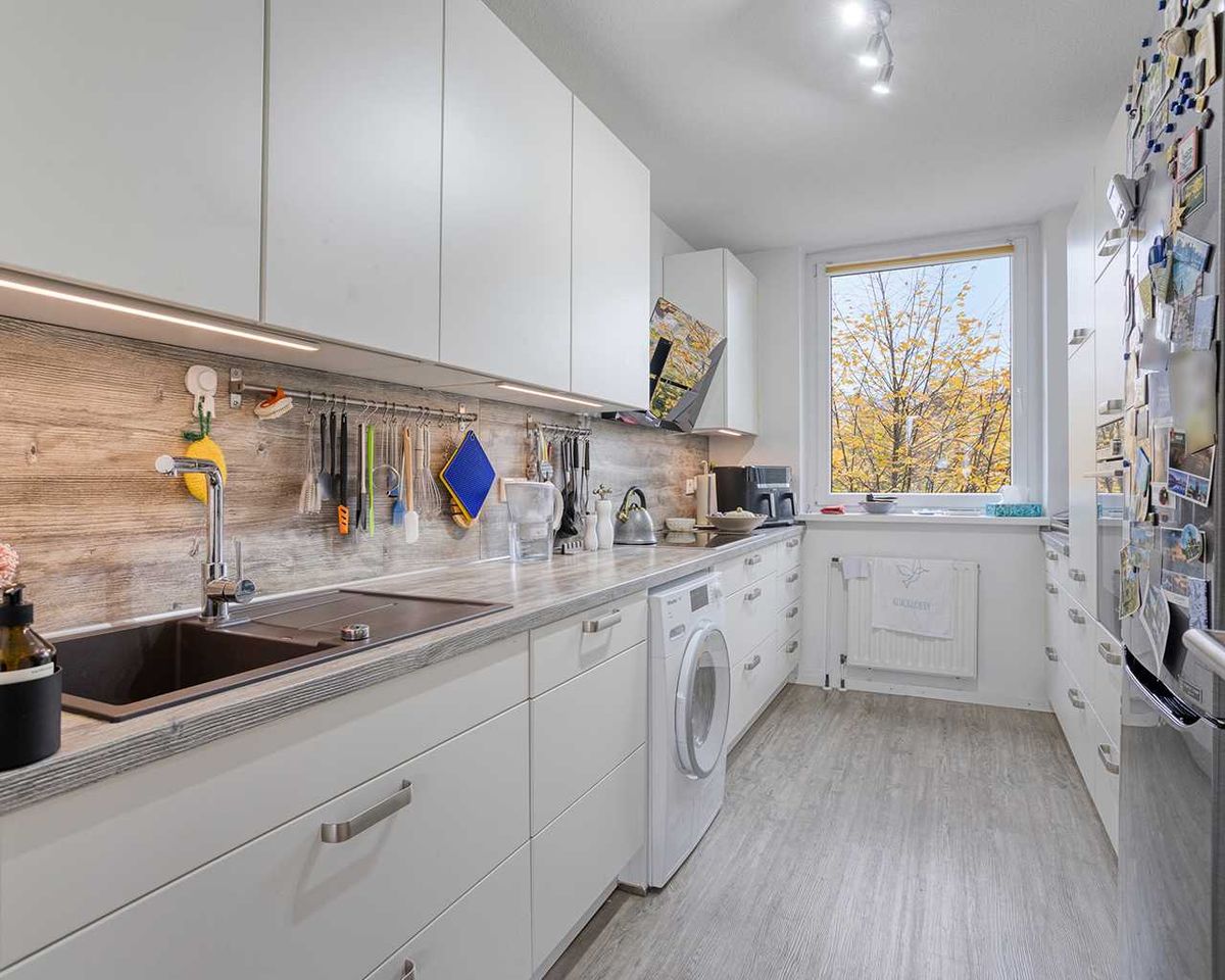 Die Wohnung verfügt auf ca. 95 m² Wohnfläche über eine zentrale Diele inklusive Abstellkammer, ein großes Wohnzimmer mit Essbereich und Zugang zur südwestlich ausgerichteten Loggia, eine helle Küche, drei gutgeschnittene Schlafräume, ein Duschbad sowie ein Wannenbad.