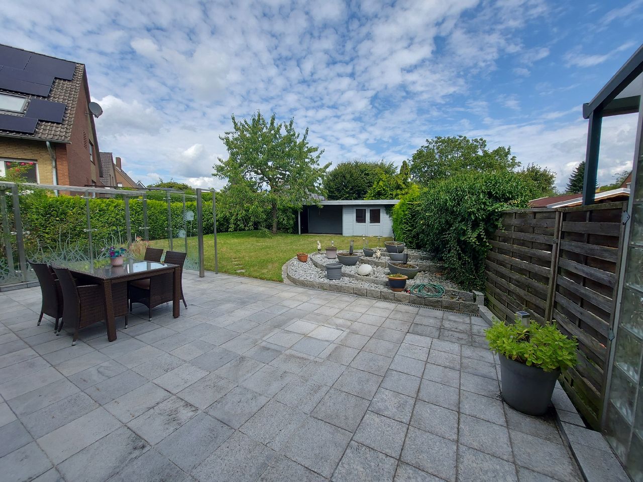 Der großzügige Garten mit Laube lädt zum Verweilen, Spielen oder Gärtnern ein. Die Terrasse mit Markise und Windschutz bietet einen geschützten Platz für Mahlzeiten im Freien oder gemütliche Abende mit Freunden und Familie.
