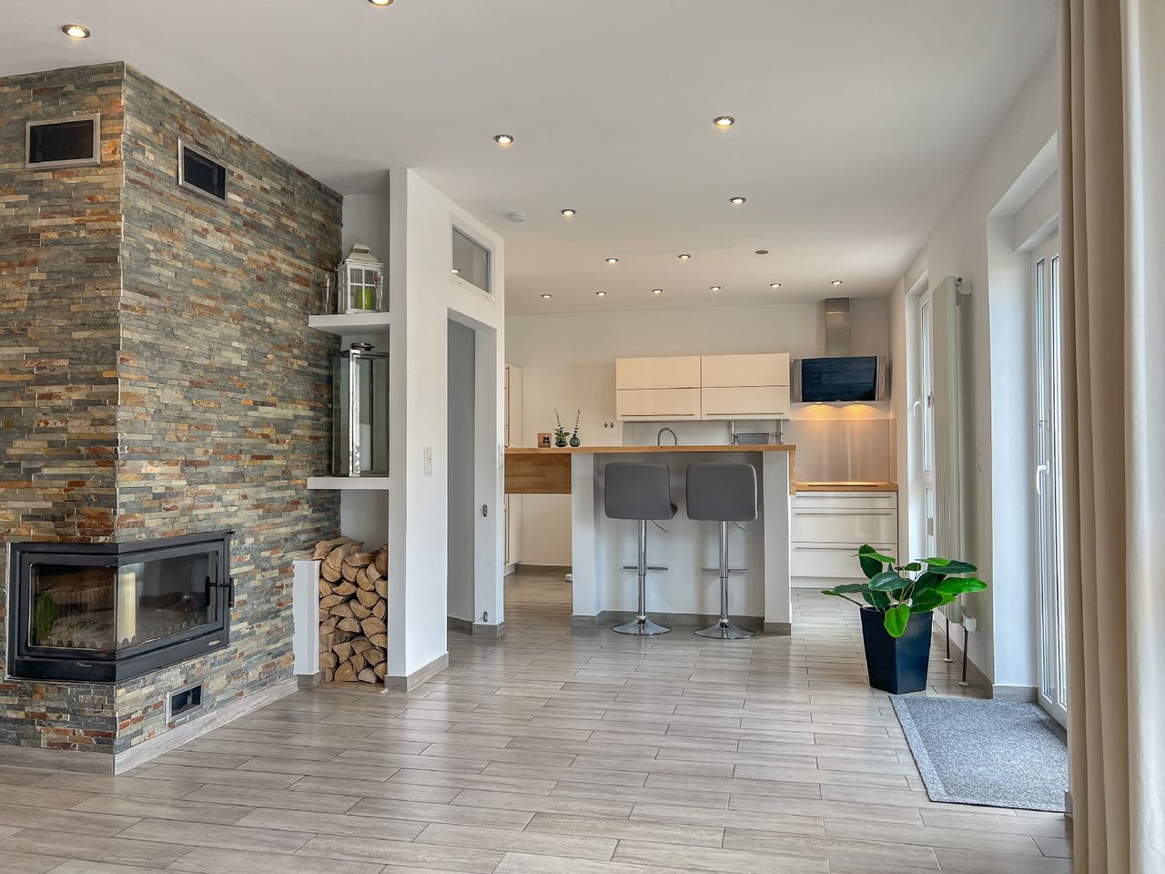 EG: offen gestaltete Küche mit Kamin zum Ess- und Wohnbereich