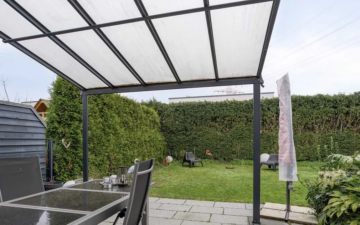 Der Garten bietet mit einer überdachten Terrasse und der sonnigen Grünzone einen perfekten Rückzugsort mit Platz zum Entspannen!