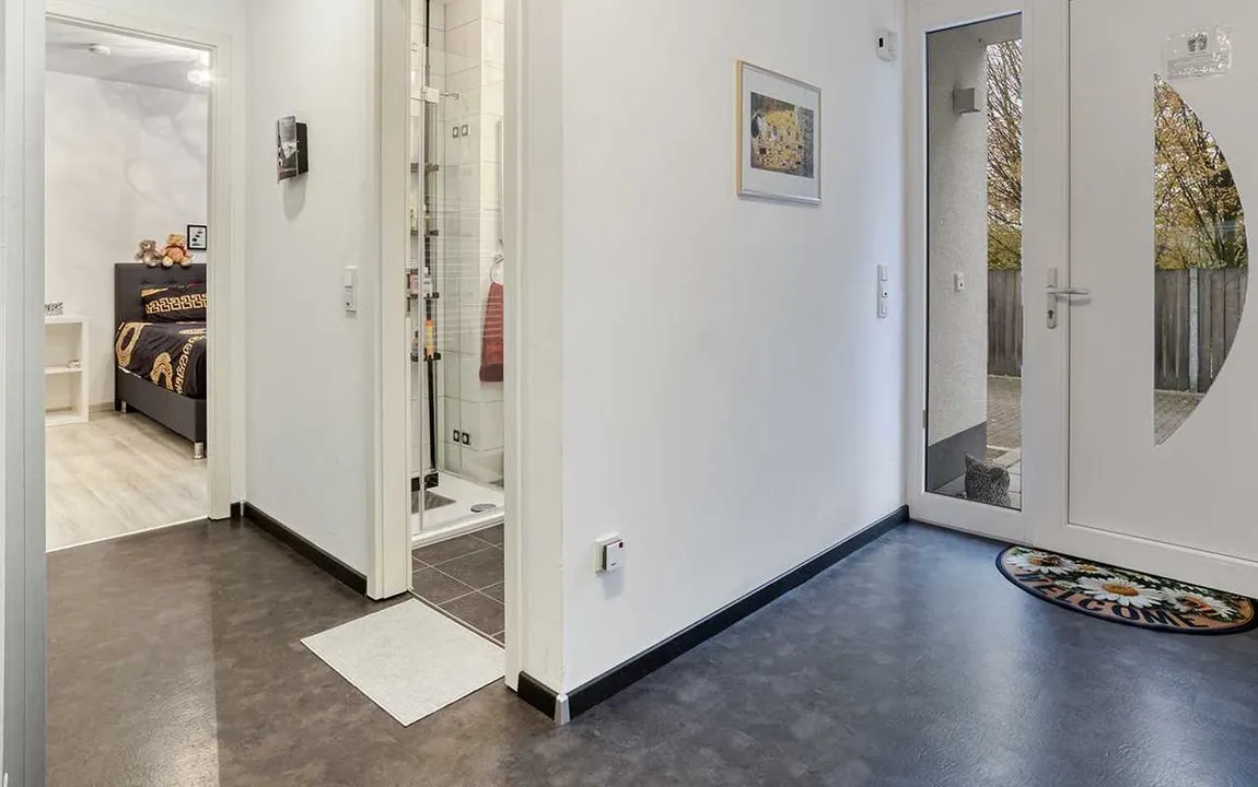 Im Erdgeschoss erwartet Sie ein einladender Eingangsbereich, ein Duschbad mit Tageslicht, ein Schlafzimmer, eine offene Küche und der sehr gemütliche Wohn-/Essbereich mit besonders hohen Decken sowie Zugang zu der vorgelagerten Terrasse und in den Garten.