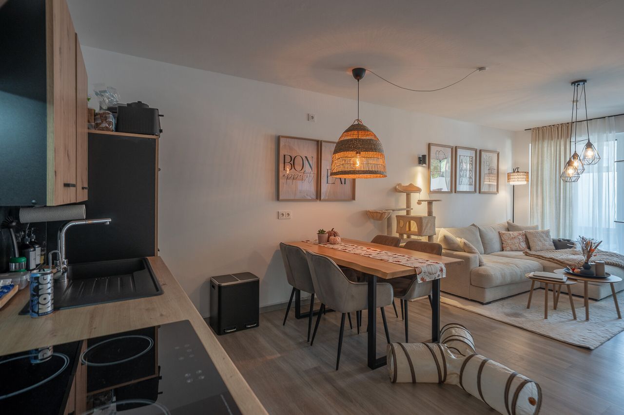 Der offene Wohn-, Ess- und Kochbereich bildet das Herz der Wohnung und lädt zum gemeinsamen Kochen, Entspannen und Verweilen ein. Vom Wohnbereich aus gelangen Sie direkt zur überdachten Terrasse – Ihr Rückzugsort an der frischen Luft, perfekt für sonnige Stunden oder entspannte Abende.