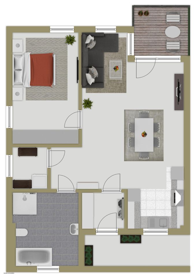 und Leben elegant miteinander verbindet. Der überdachte Balkon erweitert den Wohnraum ins
