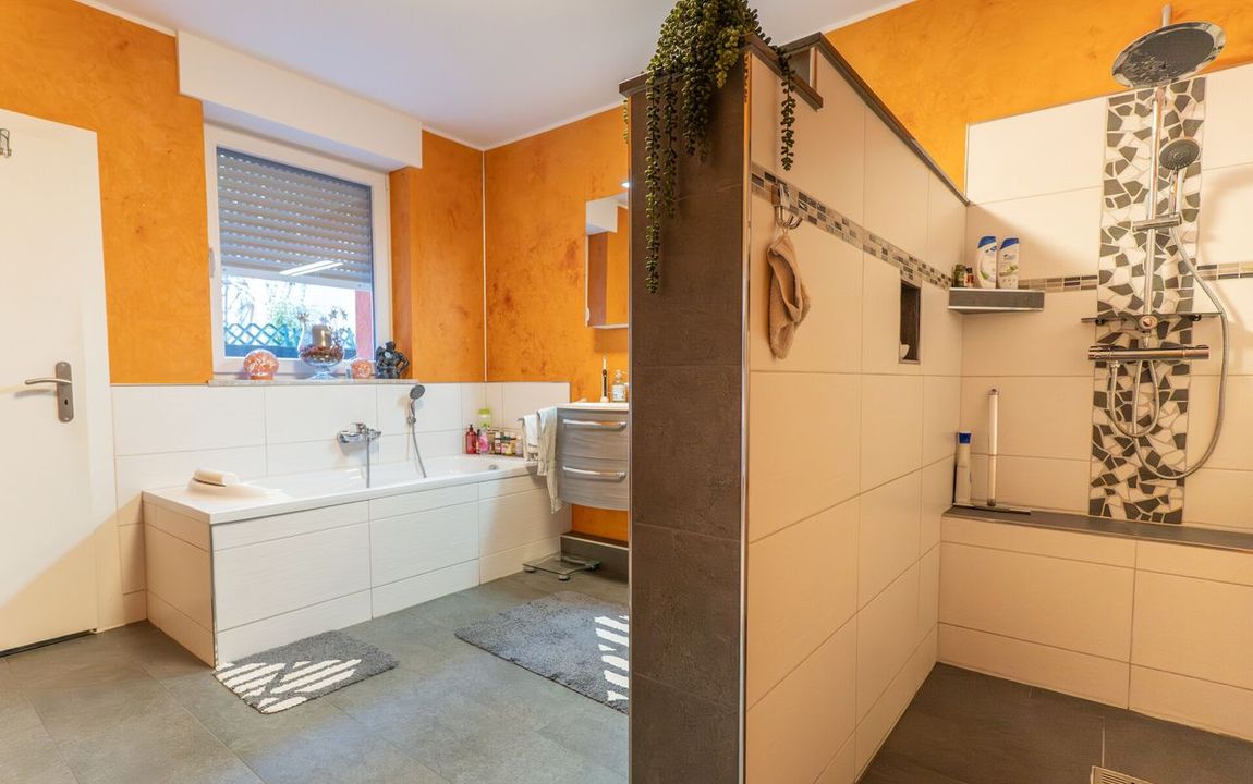 EG Tageslichtbad mit großer Walk-In- Dusche sowie separates WC mit Fenster. DG Tageslichtbad mit Dusche