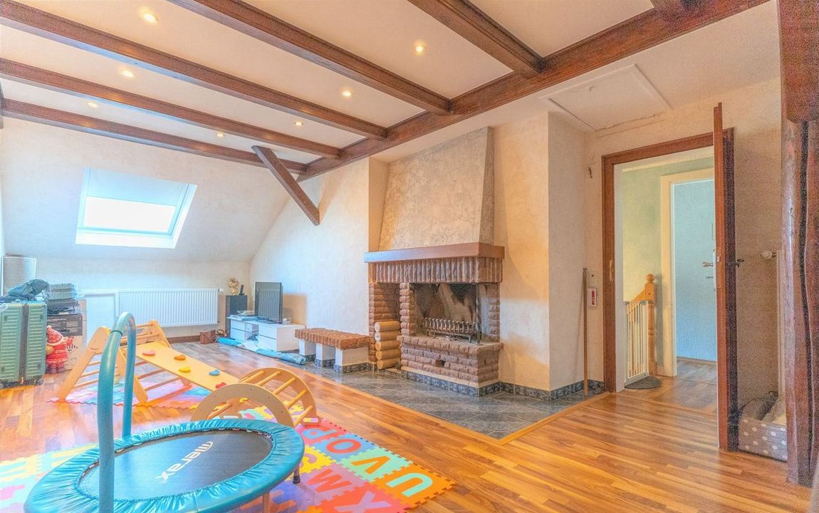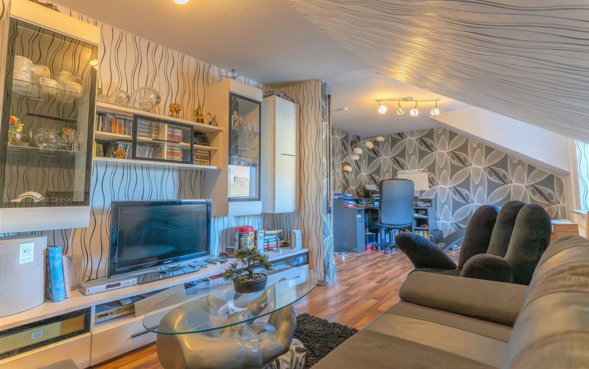 Im Dachgeschoss befindet sich auf der rechten Seite ein großzügiges Wohn-/ und Esszimmer mit offenem Kamin, das eine besonders angenehme Wohnatmosphäre schafft. Auf der linken Seite sind über eine Zwischendiele aktuell drei Schlafzimmer sowie ein ebenfalls modernes Tageslichtbad mit Dusche erreichbar. Im Falle einer Nutzung als Zweifamilienhaus kann eines der Schlafzimmer ohne größeren Aufwand zu einer Küche umgebaut werden.