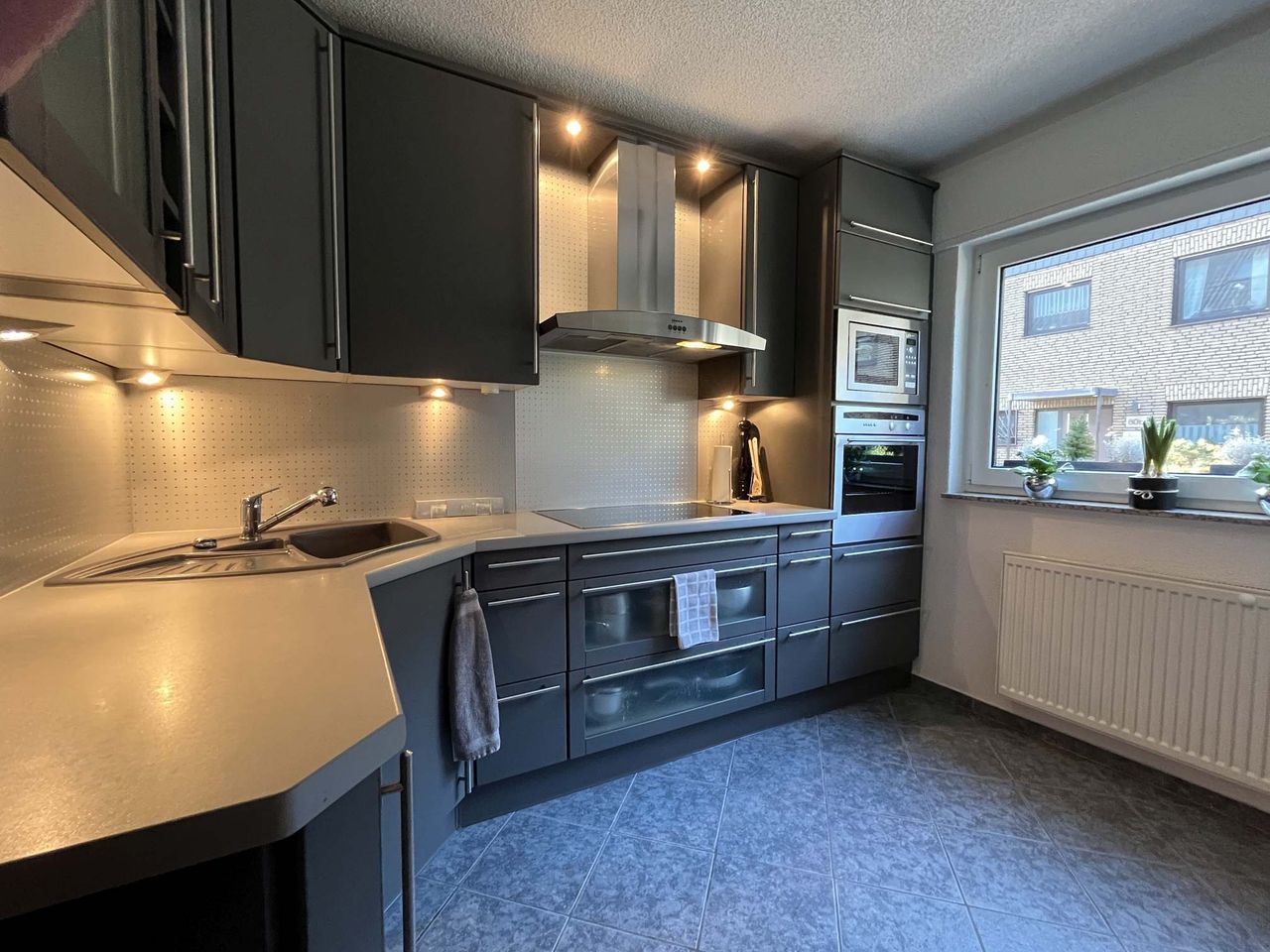 Die Ausstattung präsentiert sich aktuell wie aus dem Ei gepellt – das Haus wurde in 2002 umfassend modersinisert, u.a. graue Bodenfliesen im EG, Laminat im OG, neue Innentüren, Wände mit Rauhfaserputz versehen, Treppenhaus modernisiert, Bad und Gäste-WC ebenfalls aus 2002. Die Beheizung erfolgt über eine Öl-Zentral-Heizung mit Warmwasseraufbereitung aus dem Baujahr 1994. Lediglich das Bad im DG und die Fenster entsprechen dem Baujahr. Die Markise über der Terrasse wurde erst in 2025 erneuert. Die schicke Einbauküche ist ebenfalls bereits im Kaufpreis enthalten.