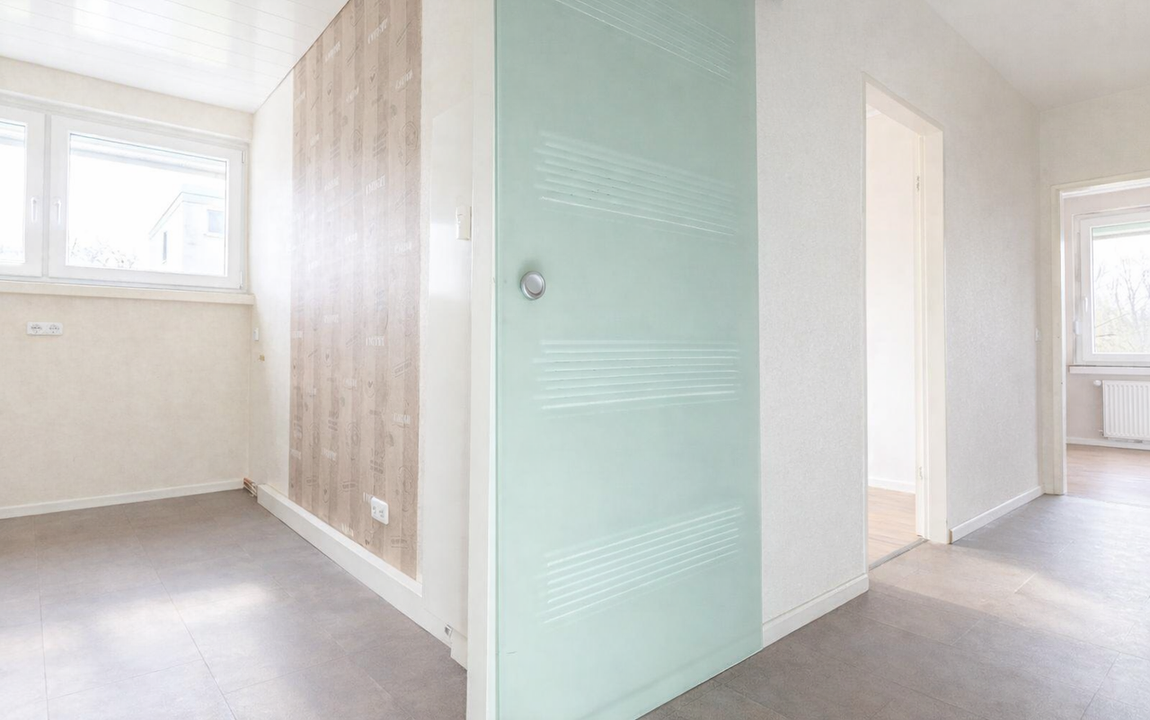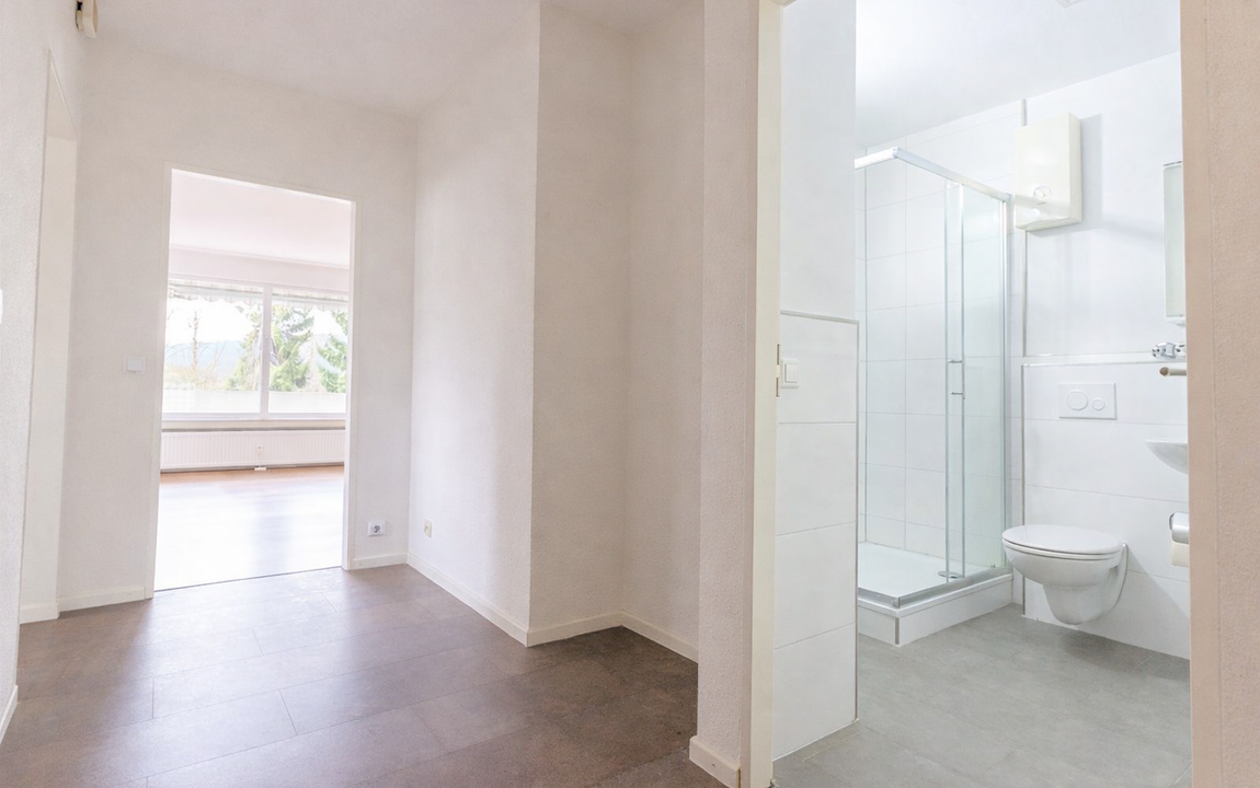 Beim Betreten der Wohnung gelangen Sie in eine Eingangsdiele mit Platz für eine Garderobe. Von hier aus erreichen Sie direkt das moderne Duschbad sowie das großzügige Wohn-/ und Esszimmer mit Zugang zur Loggia.
