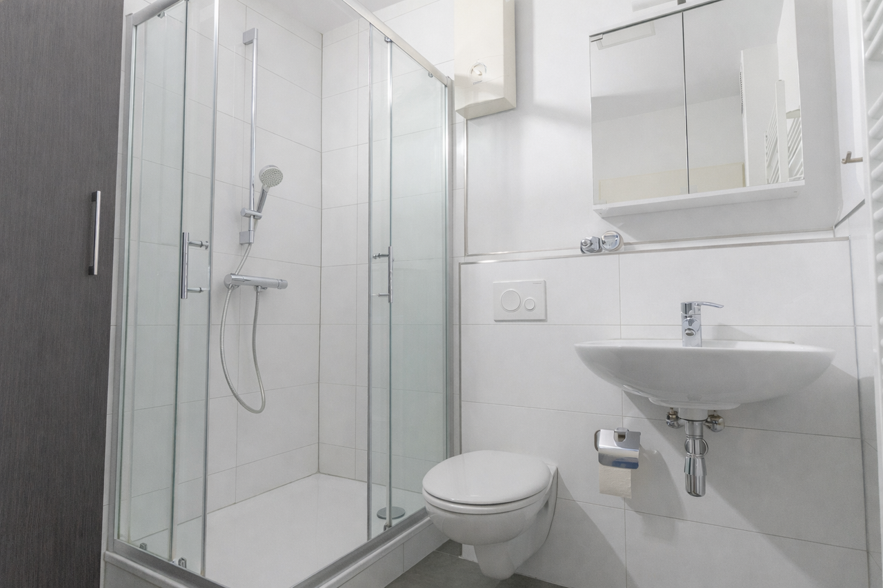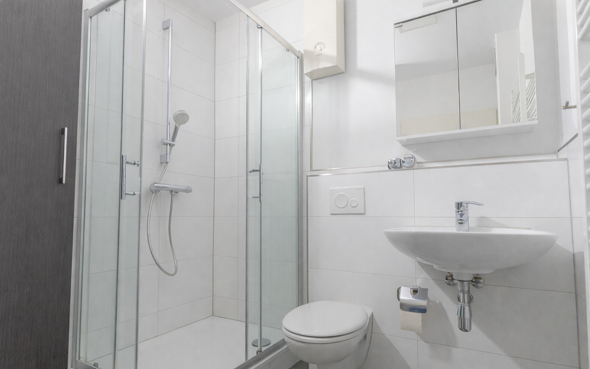 Badezimmer: Modern gefliestes und ausgestattetes Duschbad, innenliegend, erneuert 2022