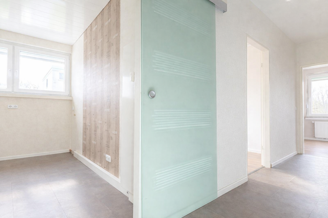Innentüren: Holztüren, weiß, sowie Glasschiebetür zur Küche, erneuert 2022/ Stahlzargen, weiß lackiert