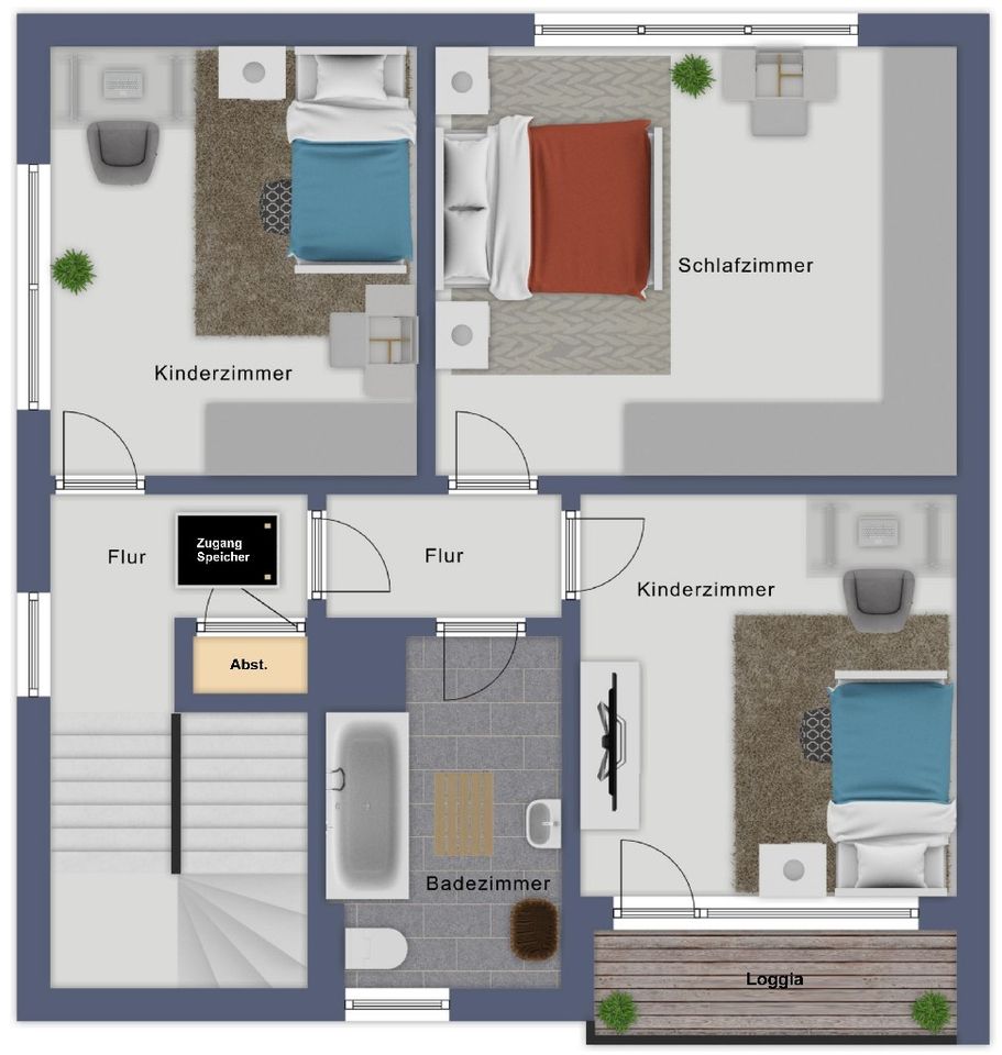 Im Obergeschoss befinden sich drei vielseitig nutzbare Zimmer, die sich ideal als Schlaf-, Kinder- oder Arbeitsräume eignen. Eines der Zimmer verfügt über einen direkten Zugang zur gartenseitig ausgerichteten Loggia. Ergänzt wird diese Etage durch ein helles Wannenbad mit Fenster sowie einen praktischen Abstellraum. Über eine Einschubtreppe erreichen Sie den begehbaren, bislang nicht ausgebauten Speicher, der weiteres Potenzial bietet.