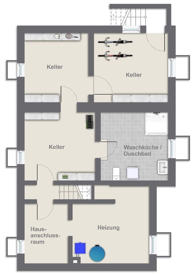 Ca. 66 m² Nutzfläche: Keller mit Gartenausgang; zwei Durchgangskeller; Waschküche mit Duschbad; Hausanschlussraum mit Heizungskeller