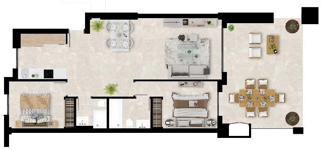 Diese Wohneinheiten befinden sich in einer privaten Wohnanlage mit insgesamt 58 Apartments mit 2 oder 3 Schlafzimmern, verteilt auf 4 Gebäude. Die Erdgeschosswohnungen haben einen eigenen Gartenabschnitt, die Apartments der ersten Etage bieten Meerblick und die exklusiven Penthouse-Apartments mit 3 Schlafzimmern und atemberaubender Terrasse beeindrucken ebenfalls mit unverbautem Blick über das Mittelmeer.