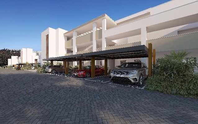 Zu allen Apartments gehört ein eigener Parkplatz im Außenbereich, beschattet durch eine Pergola über dem gesamten Parkbereich.