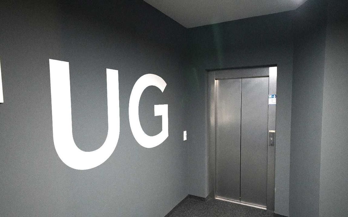 Das moderne Bürogebäude ist mit einem Aufzug und verspiegelten Sonnenschutzfenstern versehen.