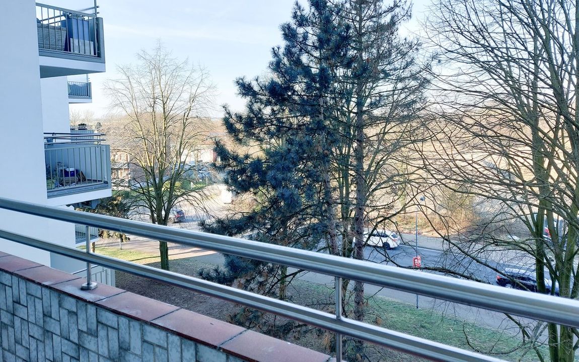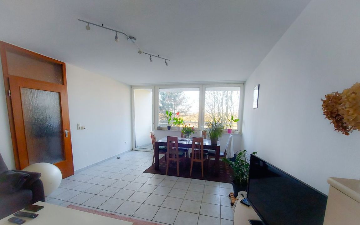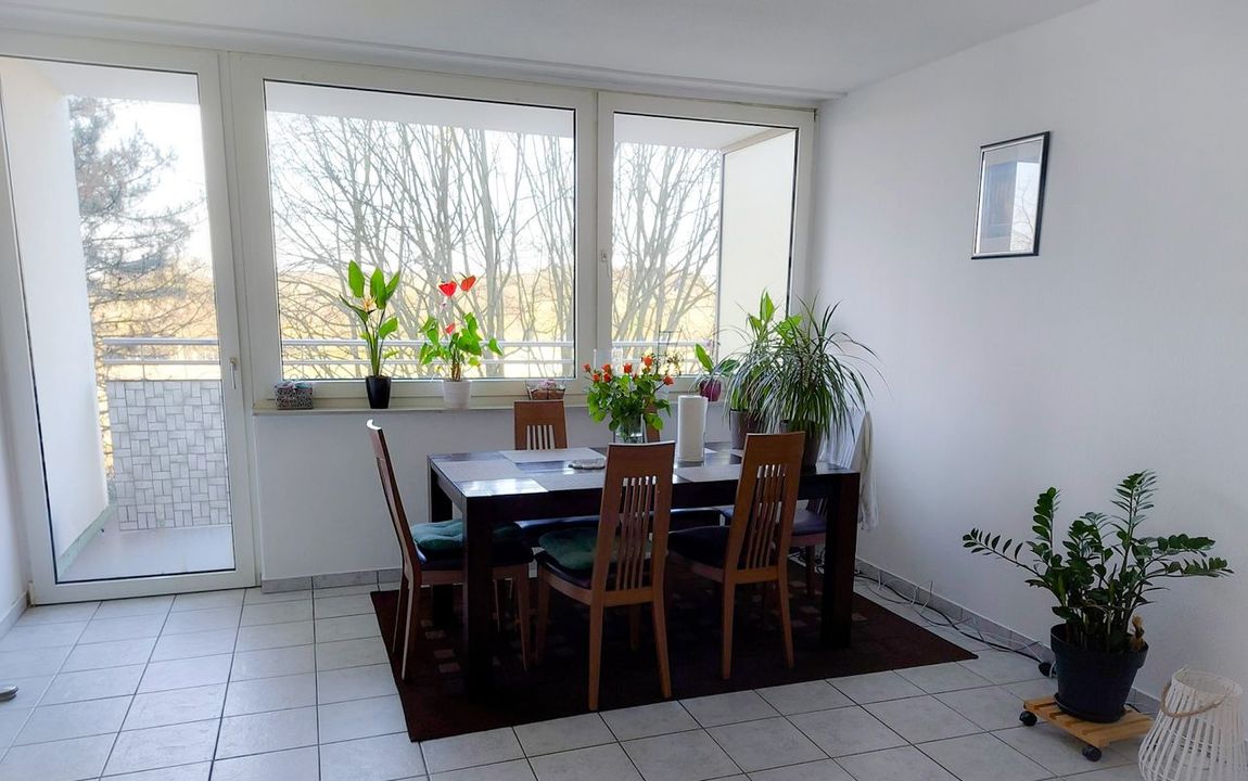 Ein geschützer Südbalkon bietet einen weiten Blick ins Grüne und lädt zum Aufenthalt ein. Sie haben sowohl vom Wohn-, als auch vom Schlafzimmer und von der Küche diesen freien Ausblick.