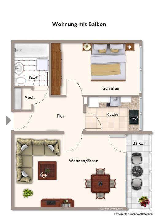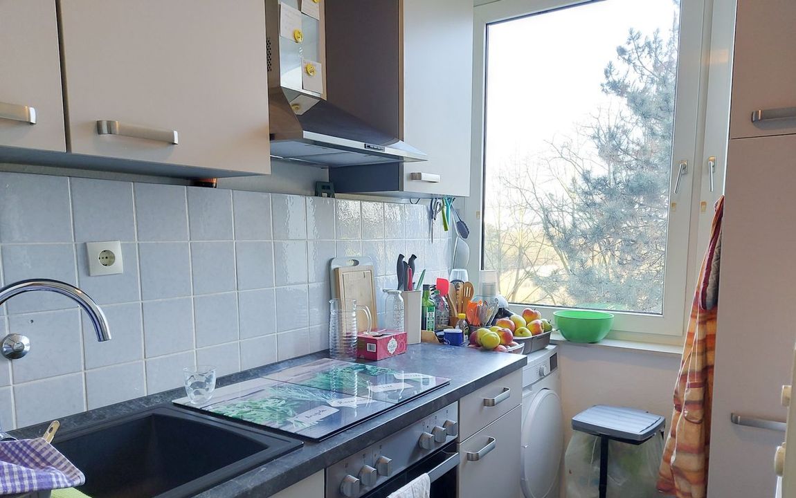 Die Wohnung ist klassisch geschnitten mit Flur, einem Schlafzimmer, Bad mit Duschwanne, Wohn-Esszimmer, separater Küche und nicht zu verachten- einem Abstellraum.