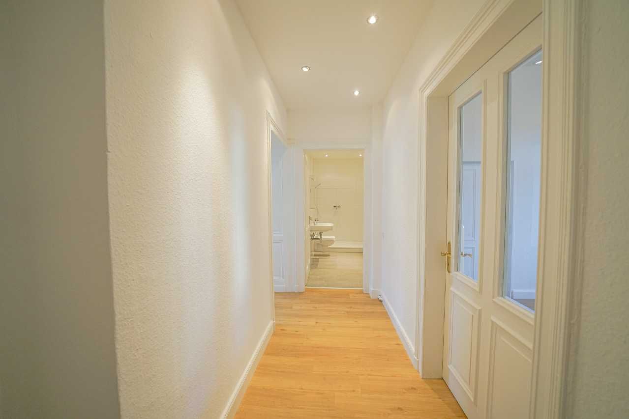 Die Wohnung ist vor wenigen Jahren, saniert worden und mit Vinylparkettboden ausgestattet. Das Badezimmer ist mit großen grauen Bodenfliesen, großen weißen Wandfliesen, einer großen Dusche mit Glastrennwand, einem Hänge-WC, einem Waschtisch, einer Handtuchhalterheizung und einem Waschmaschinenanschluss versehen. Die stilvollen Kassettentüren stammen überwiegend aus dem Baujahr und wurden aufwendig aufgearbeitet. Im Wohnzimmer befinden sich dezente Stuckelemente an der Decke. Die Küche ist mit einer hochwertigen, weißen Einbauküche mit elektrischen Markengeräten versehen (Kühlschrank und Gefrierschrank, Ceranfeld mit Dunstabzug, Backofen und Mikrowelle auf Augenhöhe sowie einer dunklen Spüle). Ein eigener Kellerraum ist ebenfalls vorhanden. Eine schnelle Internetverbindung und ein TV-Zugang sind über einen Kabel- und Telefonanschluss (Glasfaseranschluss) realisierbar. In Verbindung mit den isolierverglasten Kunststofffenstern und der Gas-Zentralheizung ergibt sich ein niedriger Energieverbrauch. Das Warmwasser wird per Durchlauferhitzer bereitgestellt.