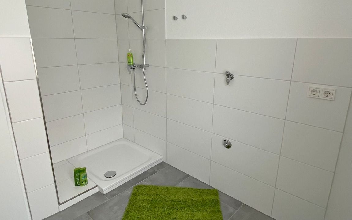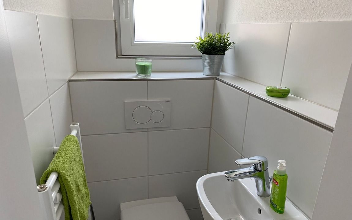 Das Bad ist mit einer Dusche sowie einem Fenster ausgestattet. Das separate WC verfügt über ein Waschtisch und ebenfalls über ein Fenster. In der gesamten Wohnung wurde moderner Vinylboden verlegt, während Bad und WC mit modernen dunklen Fliesen versehen sind.