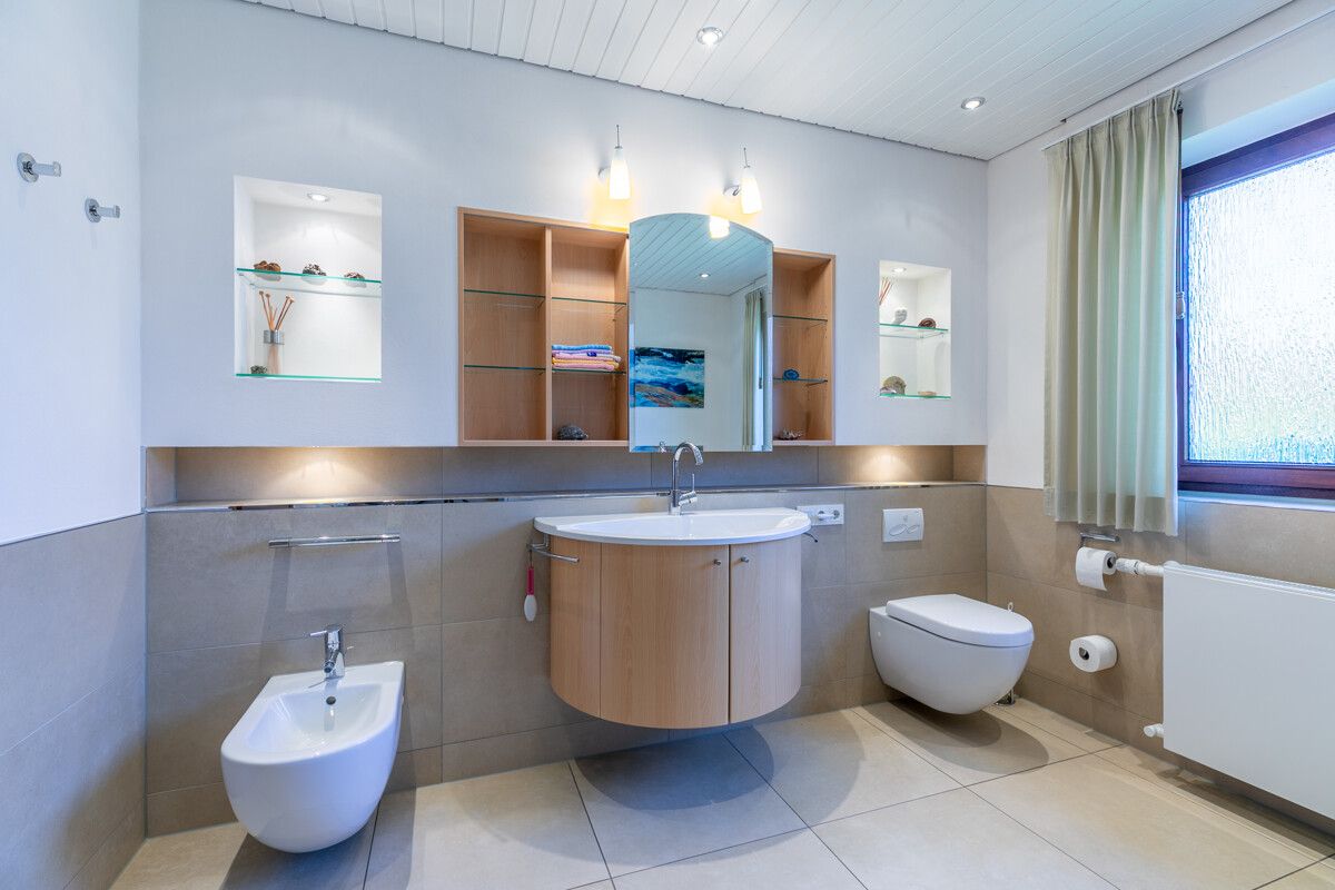 Eine Wohlfühlkur für die Sinne ist das modernisierte Vollbad mit bodentiefer Dusche und Eckbadewanne. Wer die nötige Entspannung wünscht und seinem Körper etwas Gutes tun will, wird hiervon begeistert sein. Mit seinen hellen Farbtönen und Transparenz aus Glas wirkt dieser Raum stylisch & modern.