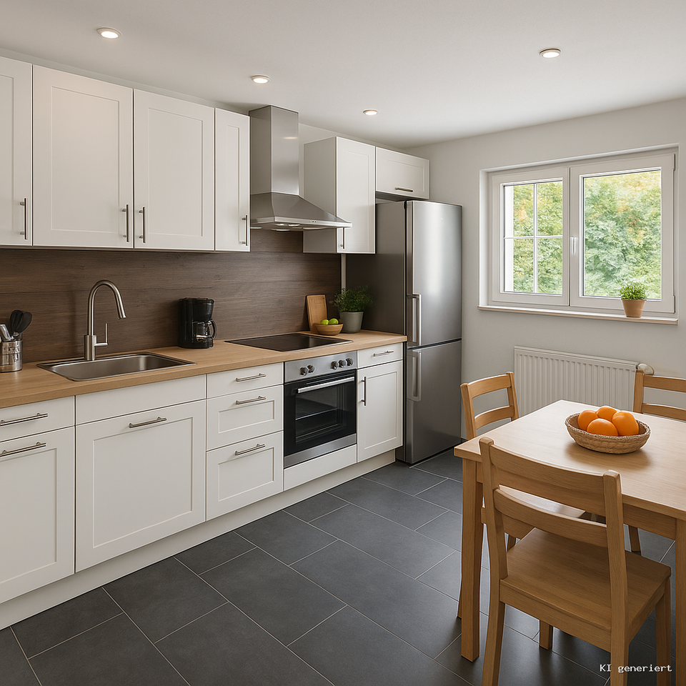 Im Erdgeschoss befinden sich ein einladender Eingangsbereich mit Gäste-WC, eine Küche mit angrenzendem Vorratsraum sowie ein großzügiges Wohnzimmer mit breiter Fensterfront und direktem Zugang zur Terrasse und in den Garten.