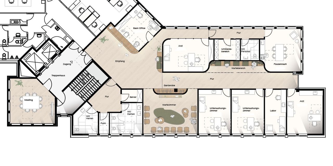 Die Flächen werden individuell nach Bedarf unterteilt und ausgestattet. Daher sind neben klassischen Behandlungsräumen, Arztzimmern und Wartebereichen auch große Räume für Sportangebote im Bereich Physiotherapie, eigene Labore oder Räumlichkeiten für diagnostische Zwecke realisierbar.