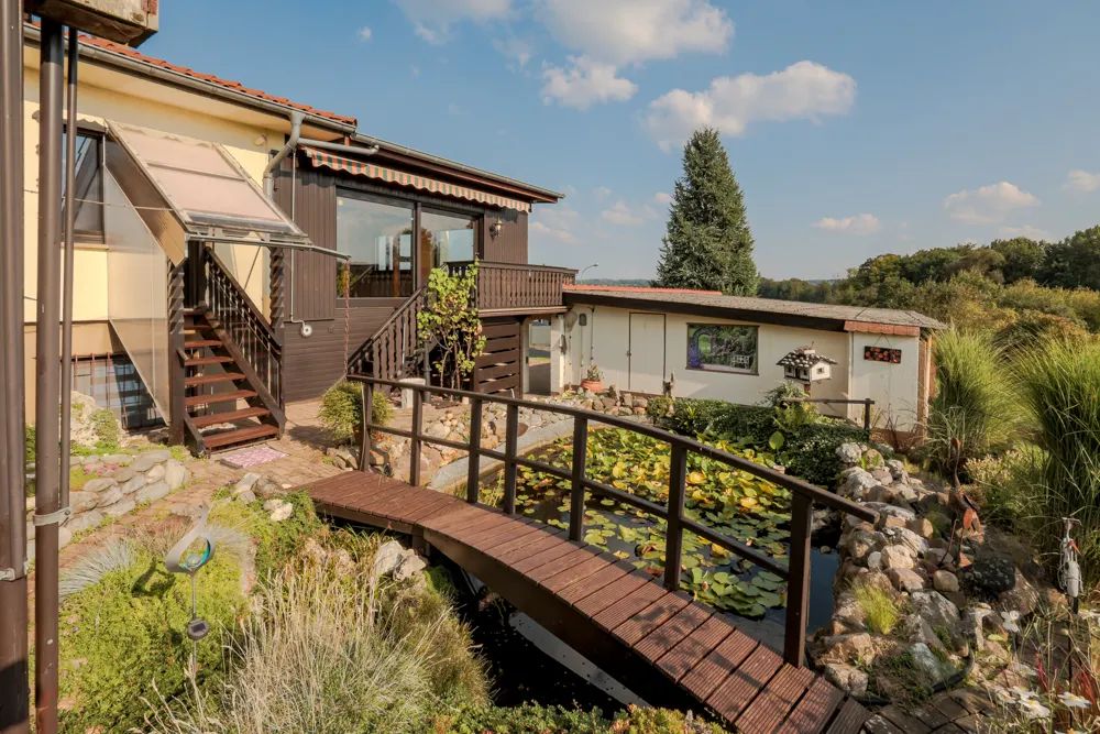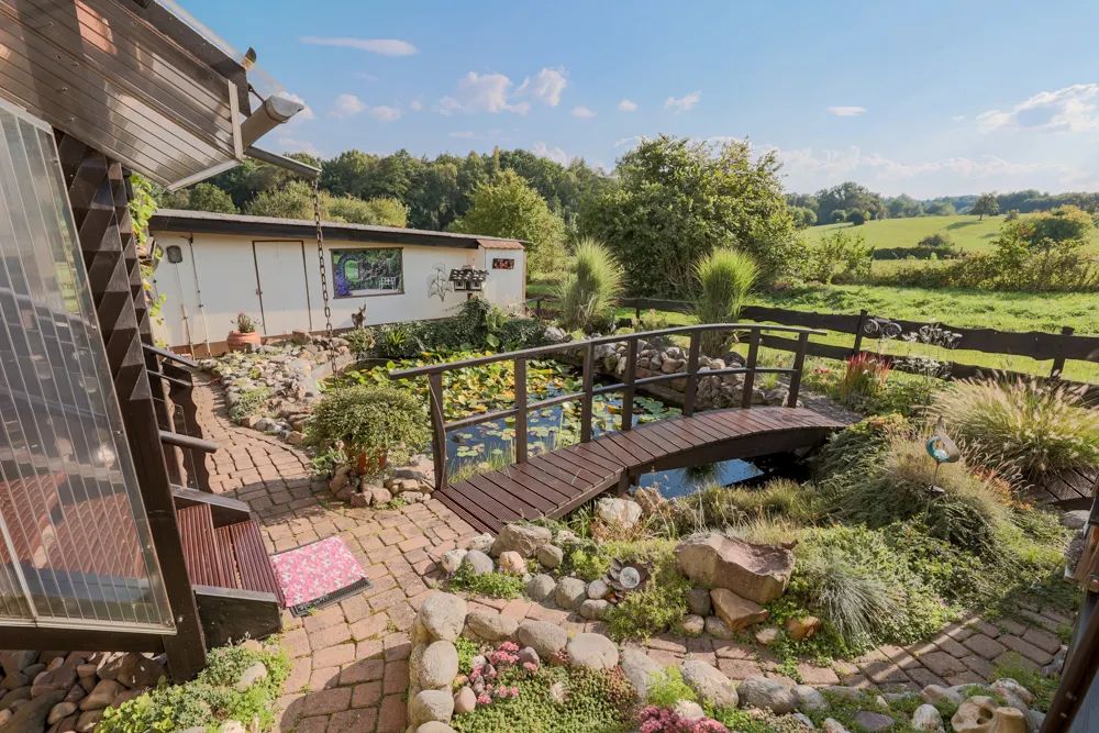Während vor und neben dem Haus in erster Linie Rasenfläche zu finden ist, sorgt hinter dem Gebäude ein Wintergarten und ein großer Teich, der durch eine hübsche Brücke überquert werden kann, für eine idyllische Atmosphäre.