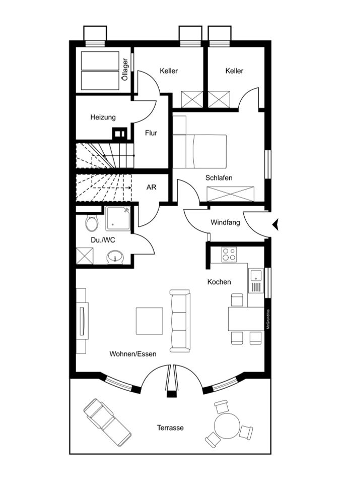 Die separat zugängliche Einliegerwohnung im Souterrain profitiert dank der Hanglage von bodentiefen Fenstern und einem direkten Zugang zur eigenen Terrasse. Sie verfügt über ein Schlafzimmer mit angrenzendem Ankleidezimmer, ein Badezimmer sowie einen offenen Wohnbereich mit integrierter Küche – ideal für Gäste, Familienmitglieder oder zur Vermietung.