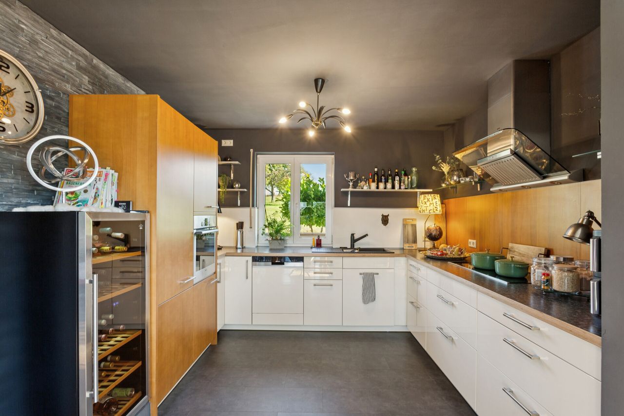 Das Haupthaus erstreckt sich über zwei Etagen und bietet ein modernes, offenes Wohnkonzept. Im Erdgeschoss befindet sich eine offene Küche mit angrenzendem Wohn- und Essbereich, der durch große Fensterflächen lichtdurchflutet ist. Ein Gäste-WC sowie ein praktischer Abstellraum ergänzen das Raumangebot. Vom Wohnbereich gelangt man direkt auf den Balkon, der einen herrlichen Blick ins Grüne bietet.