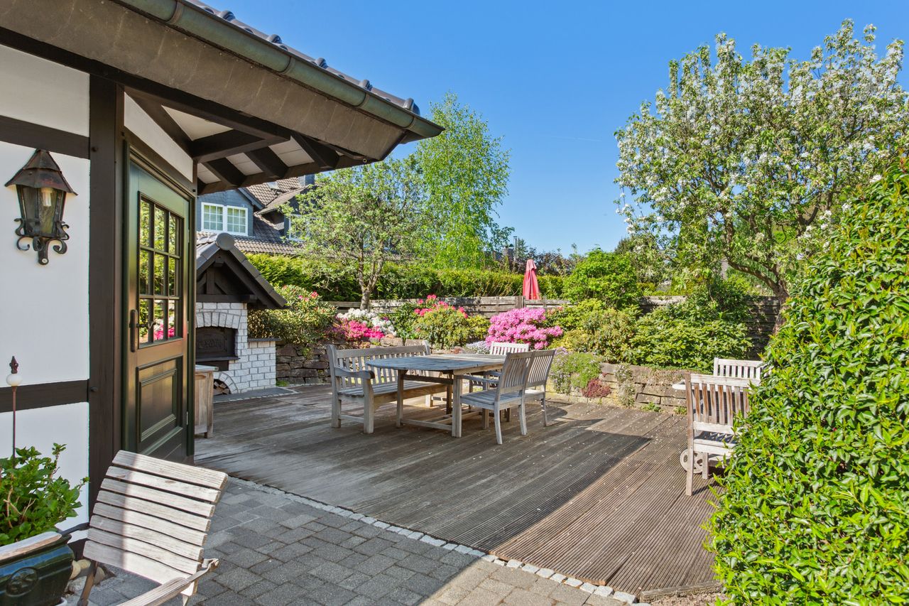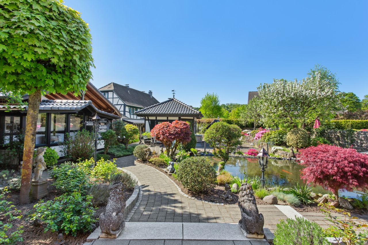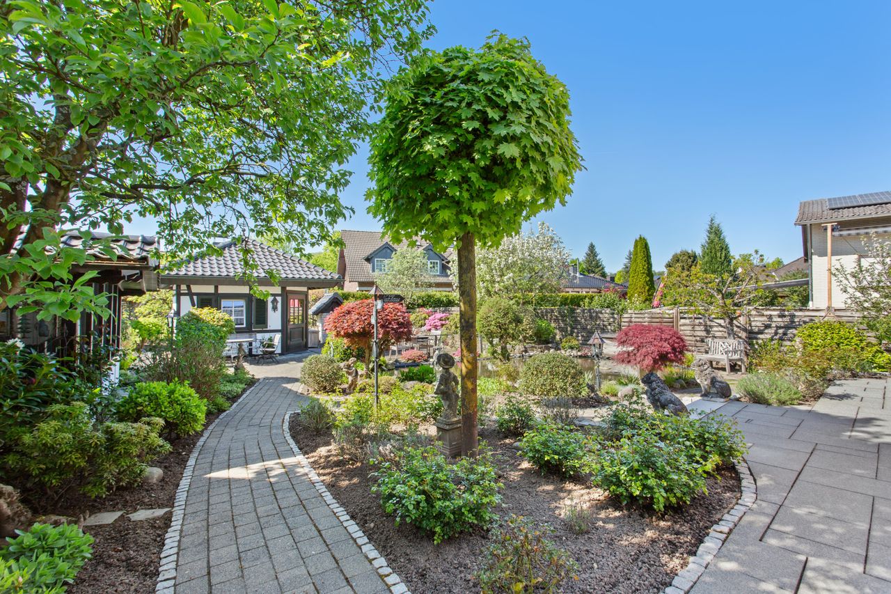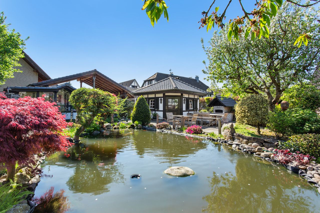 Der Außenbereich wurde mit viel Liebe gestaltet und bietet verschiedene Möglichkeiten zur Nutzung und Erholung. Ein Gartenhaus mit Kamin und eigener Terrasse eignet sich ideal für gemütliche Stunden im Freien. Abgerundet wird das Angebot durch einen Holzbackofen, der den Garten zusätzlich aufwertet. Ein idyllischer Teich mit Koi-Karpfen unterstreicht die Exklusivität dieses Anwesens.