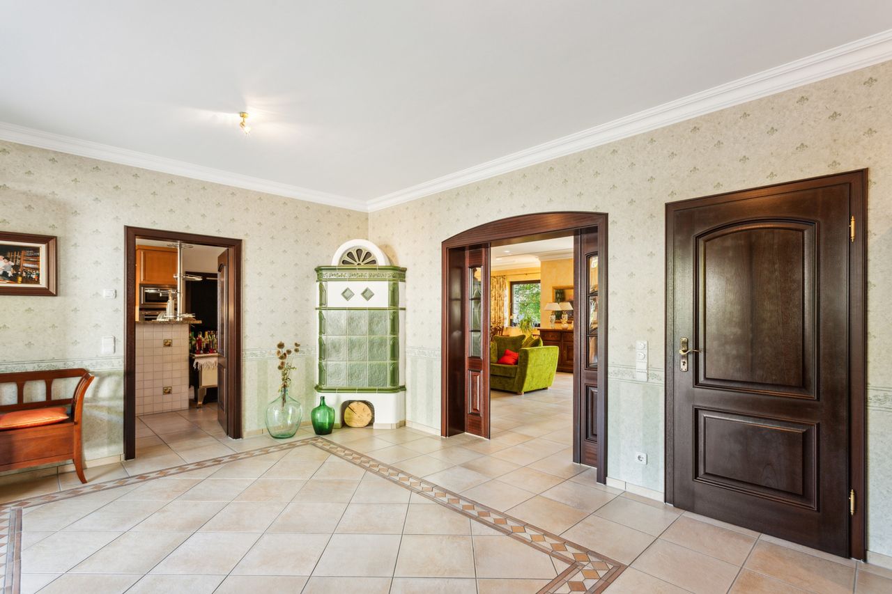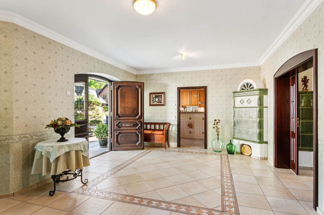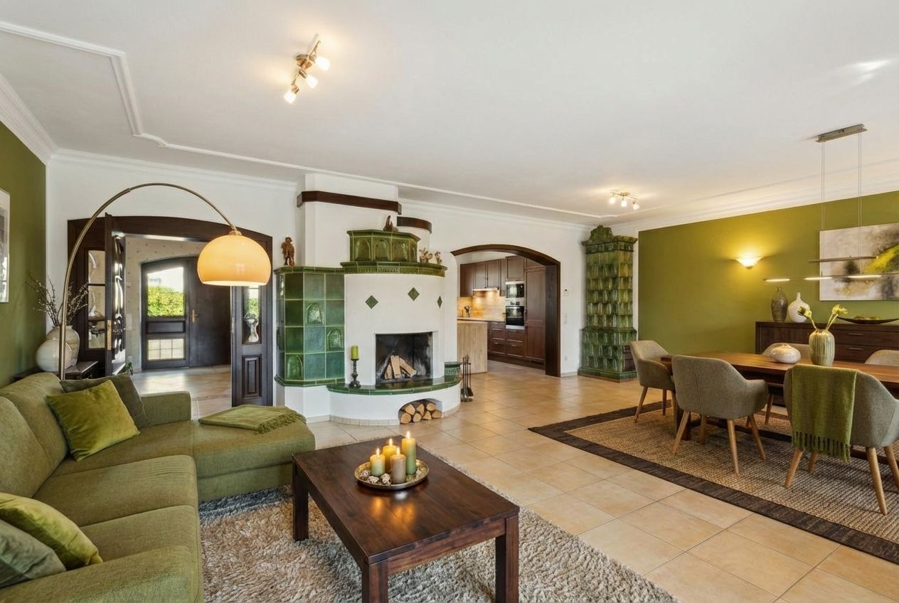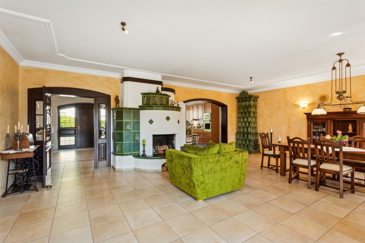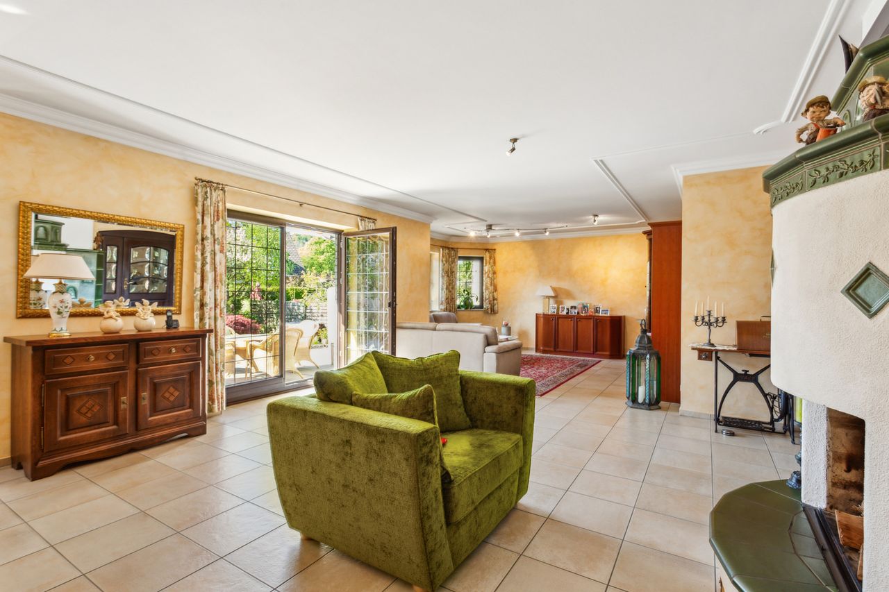 Dieses besondere Einfamilienhaus überzeugt durch eine solide Bauweise, eine klare Grundrissgestaltung und einen gepflegten Garten, der den Außenbereich zu einem besonderen Highlight macht. Bereits beim Eintreten empfängt Sie ein großzügiger Eingangsbereich, von dem aus die offene Wohnküche erreichbar ist. Sie bietet ausreichend Platz für gemeinsames Kochen und fügt sich harmonisch in den angrenzenden Wohn- und Essbereich ein. Dieser besticht durch seine großzügige Gestaltung, einen Kamin sowie den direkten Zugang zur Terrasse.