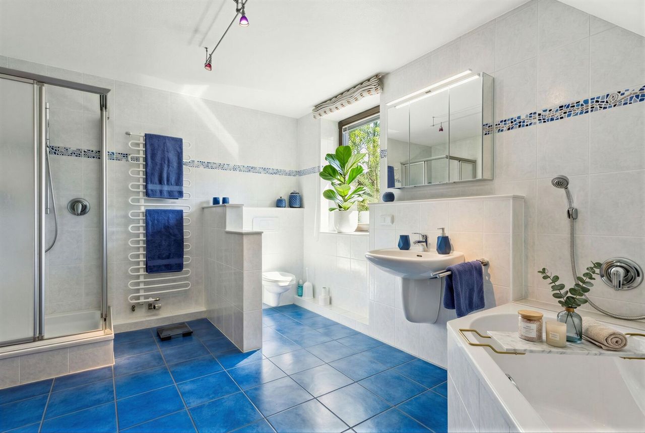 Im Obergeschoss stehen drei Schlafzimmer zur Verfügung, die jeweils über einen eigenen Zugang zu einem Badezimmer verfügen. Ein seltener Komfort, der den Wohnwert deutlich erhöht. Zusätzlich ist ein Ankleidezimmer vorhanden, das an eines der Schlafzimmer anschließt.