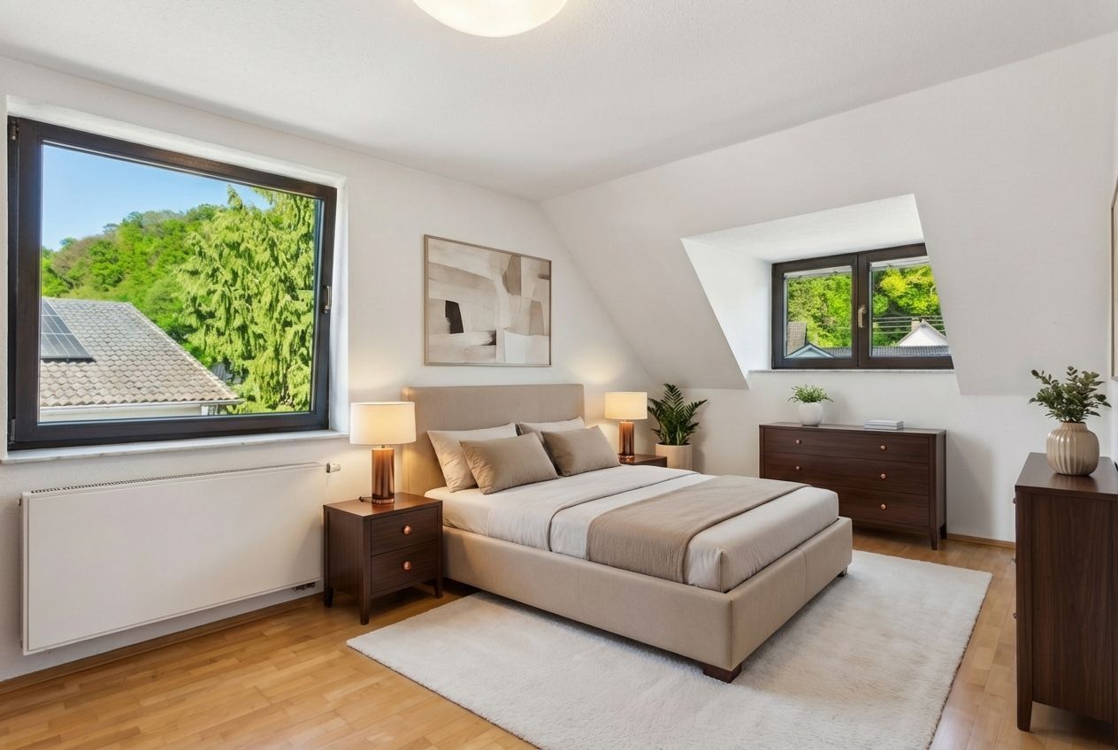 Bestimmte Aufnahmen wurden mittels KI neu gestaltet, indem die Möblierung verändert oder eine modernisierte Optik erzeugt wurde.