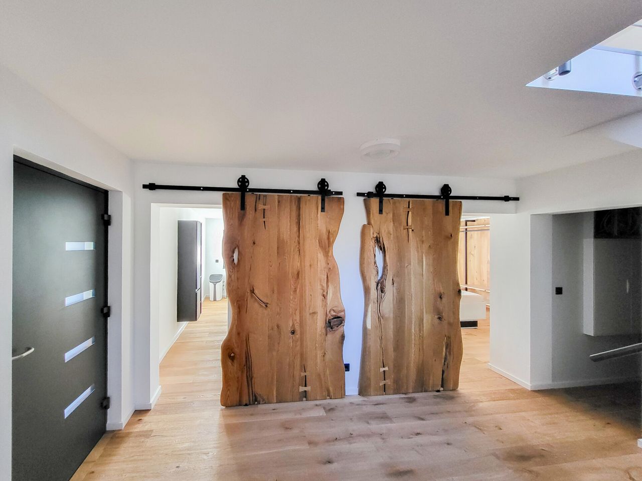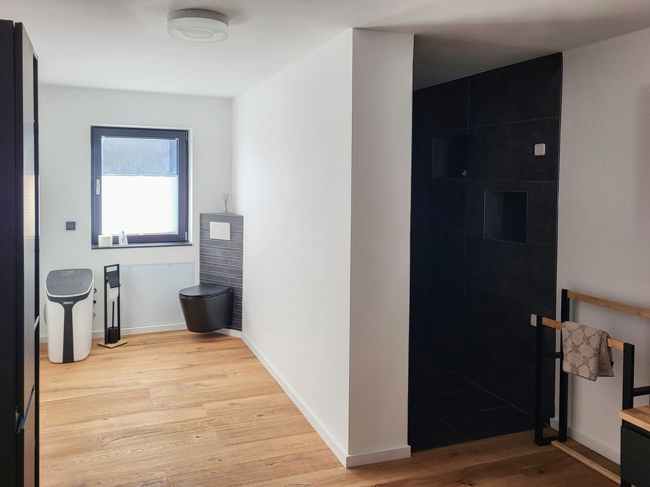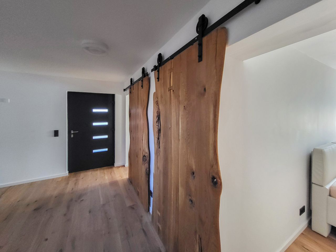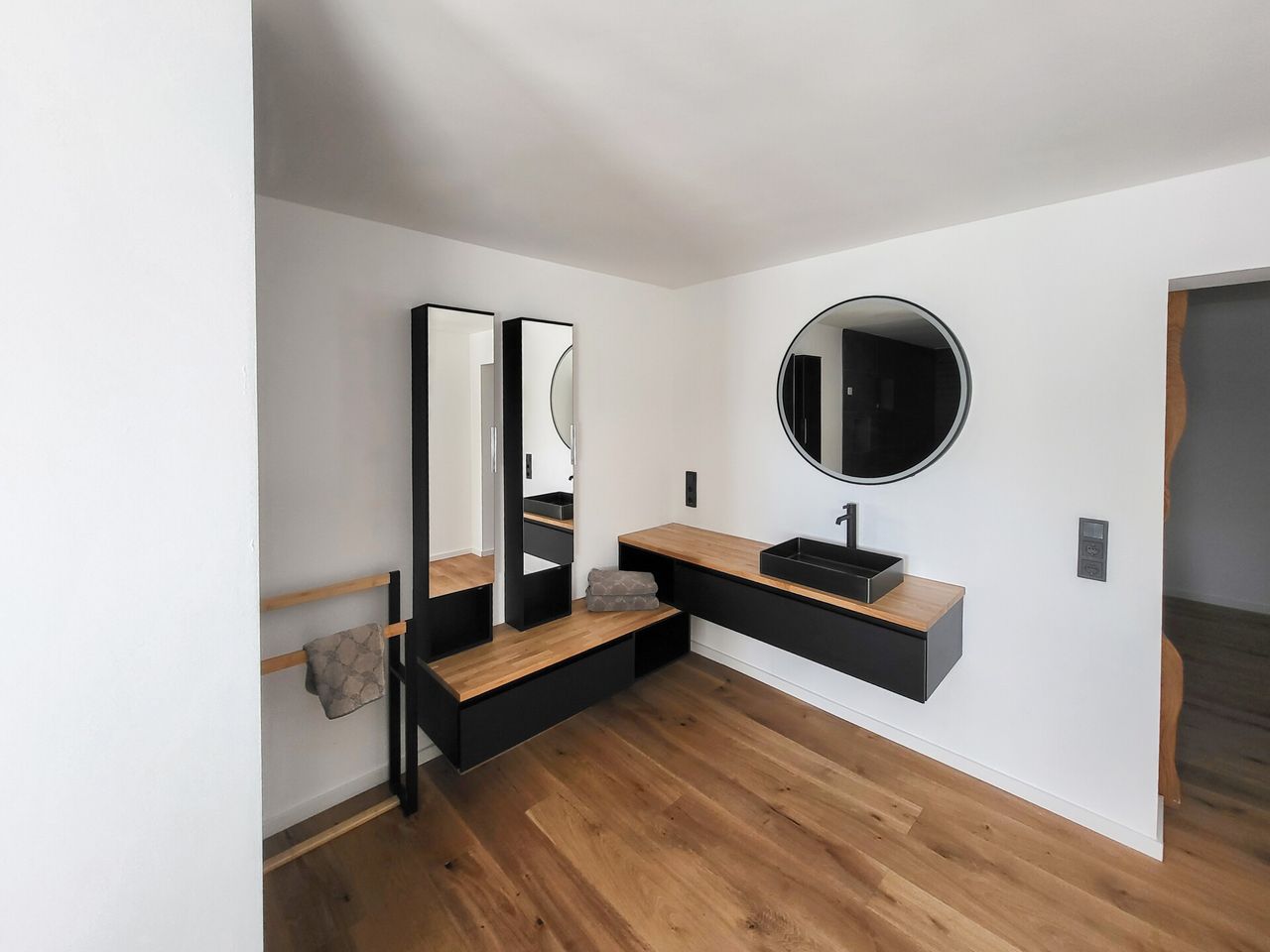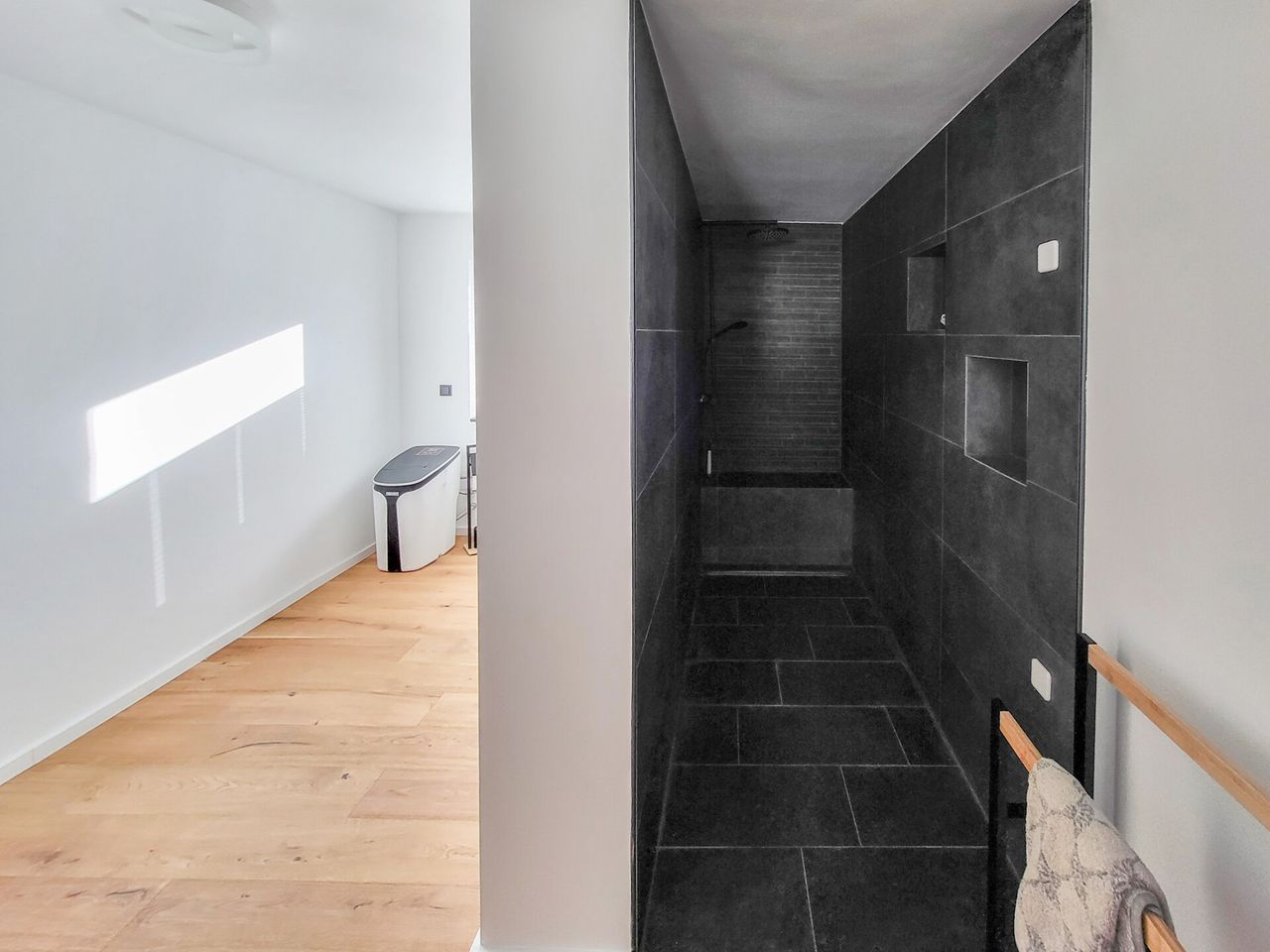 Im Erdgeschoss betreten Sie über eine lichtdurchflutete Diele das hochwertig ausgestattete Badezimmer mit großzügiger Walk-in-Dusche, das Schlafzimmer sowie den Hauswirtschaftsraum. Badezimmer und Schlafzimmer sind durch edle Echtholz-Schiebetüren von der Diele abgetrennt und unterstreichen den hochwertigen Charakter des Hauses.