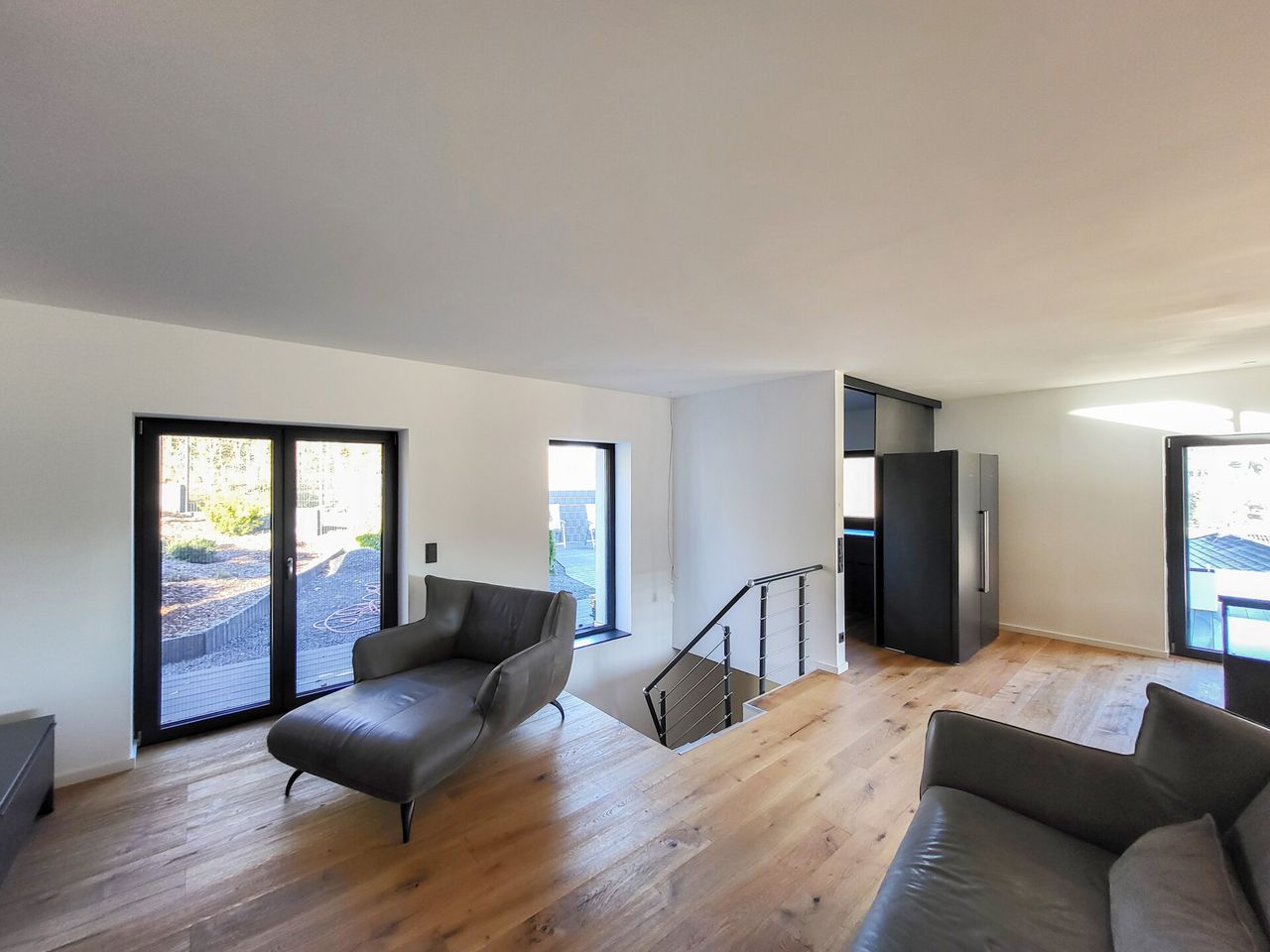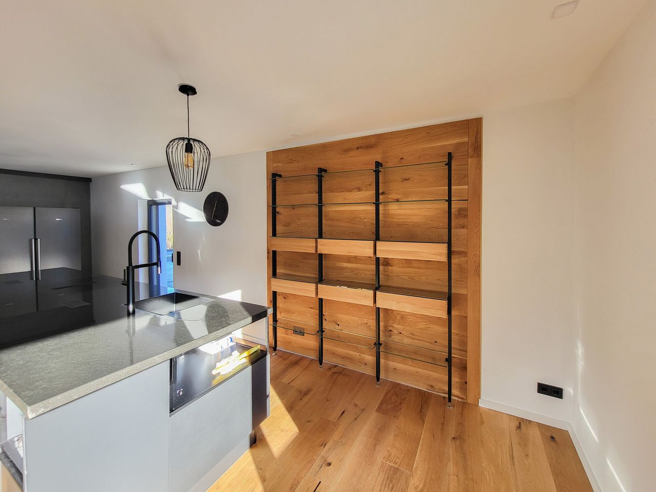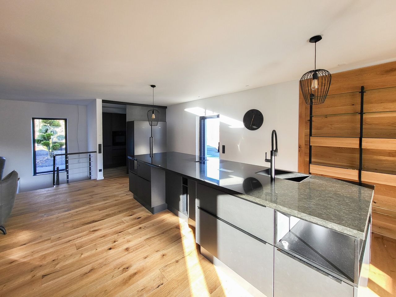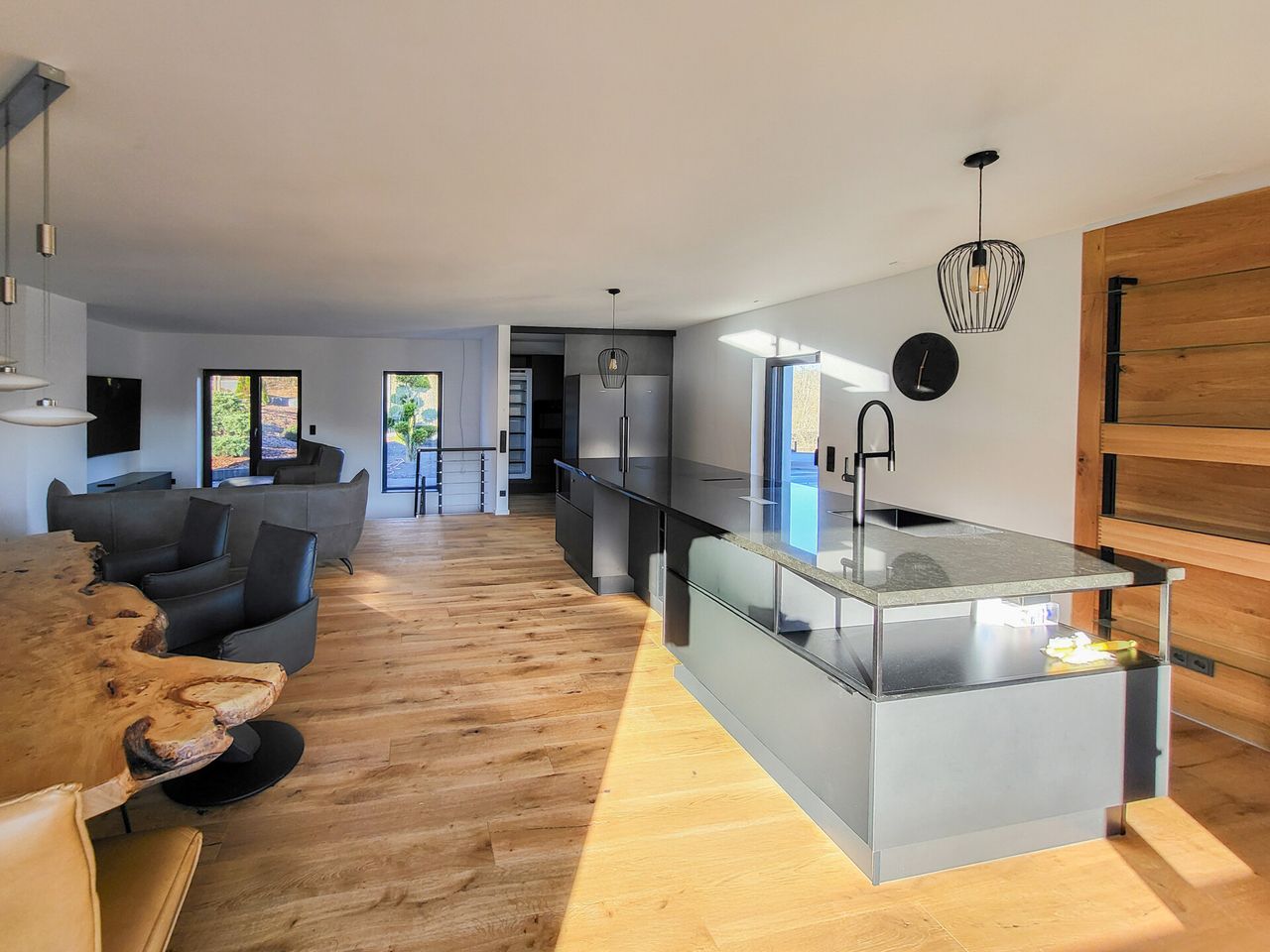 Über das offen gestaltete Treppenhaus gelangen Sie in das Obergeschoss. Hier erwartet Sie auf ca. 60 m² ein beeindruckender Koch-, Wohn- und Essbereich. Besonderes Highlight ist die große Kochinsel, die zum Kochen und Verweilen einlädt. Zusätzlich steht Ihnen ein separater Nebenraum zur Verfügung, der derzeit als zweite Küche genutzt wird und weitere Arbeits- sowie Abstellflächen für Küchengeräte bietet.