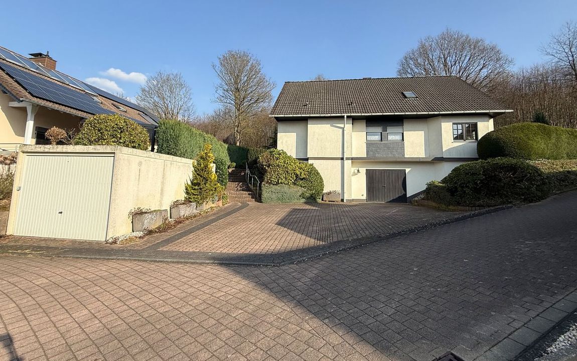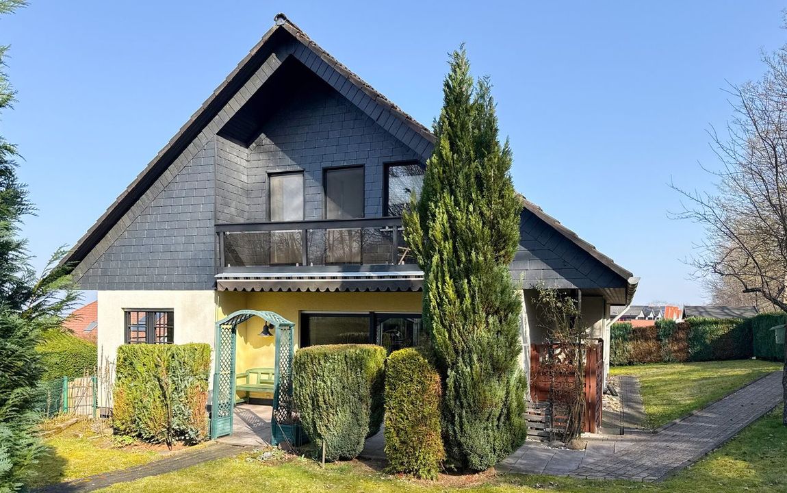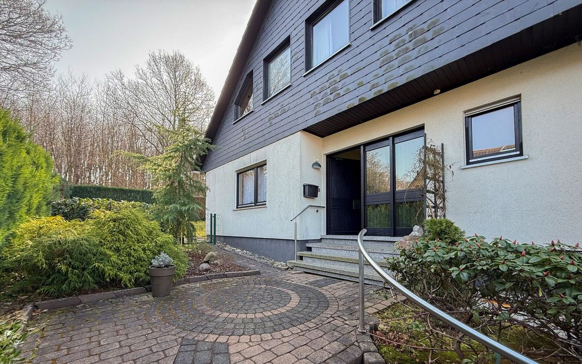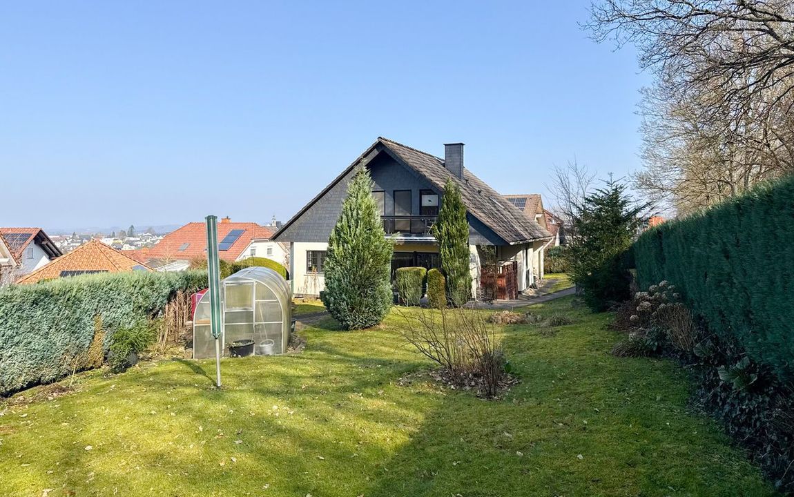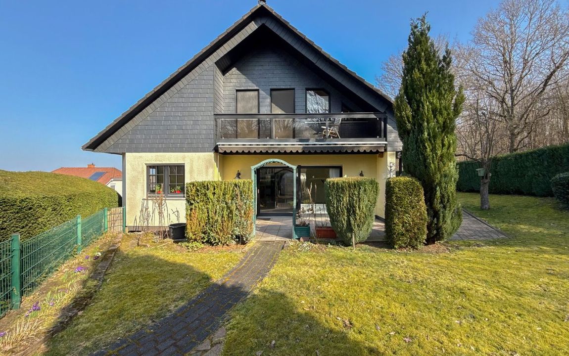 Dieses gepflegte Einfamilienhaus aus dem Jahr 1986 bietet mit rund 160 m² Wohnfläche auf einem ca. 868 m² großen Grundstück vielseitige Möglichkeiten. Es handelt sich um ein Fingerhut-Fertighaus mit durchdachter Aufteilung und der Option, das DG als Einliegerwohnung zu nutzen. Die Lage in einem verkehrsberuhigten Bereich ist besonders attraktiv für Familien. Direkt angrenzend an den Waldrand genießen Sie hier Ruhe und ein angenehmes Wohnumfeld. Das EG ist altersgerecht gestaltet und überzeugt durch eine schöne, offene Raumaufteilung. Küche und Essbereich gehen harmonisch ineinander über und öffnen sich zum Wohnzimmer mit Kachelofen. Eine große Fensterfront, zur Südterrasse ausgerichtet, sorgt für viel Tageslicht. Ergänzt wird diese Ebene durch ein Gäste-WC und ein Schlafzimmer mit Bad – ideal für komfortables Wohnen auch im Alter. Im DG stehen zwei Schlafzimmer, ein Bad sowie eine Wohnküche zur Verfügung. Dieser Bereich eignet sich hervorragend für größere Kinder, Gäste oder als separater Wohnraum. Vom Balkon aus haben Sie einen tollen Blick auf das Grundstück. Das Haus ist massiv, vollunterkellert und bietet reichlich Platz für Hobby oder Werkstatt. Ein Gewächshaus, eine Einzelgarage sowie 3–4 Stellplätze runden das Angebot ab.