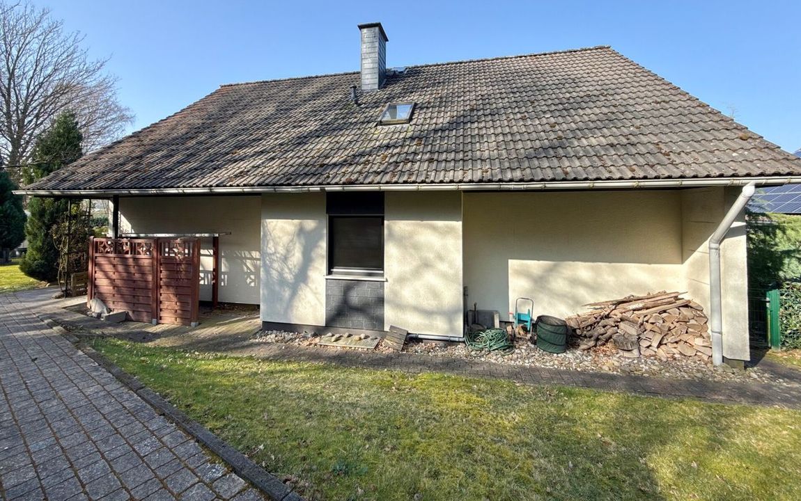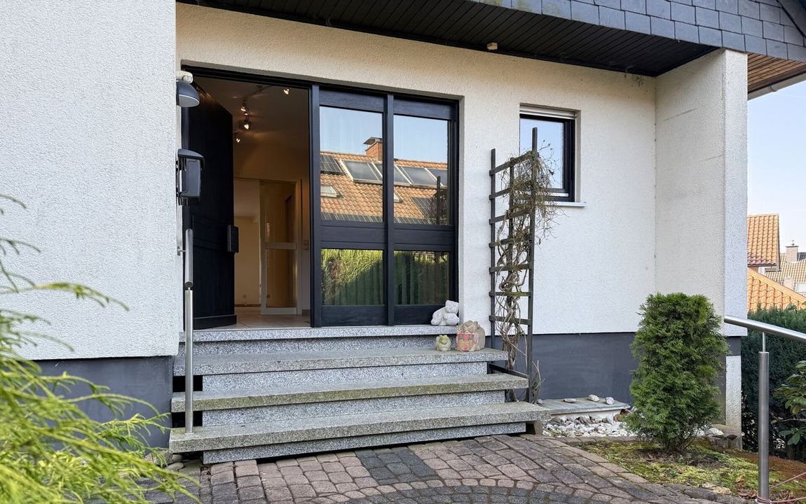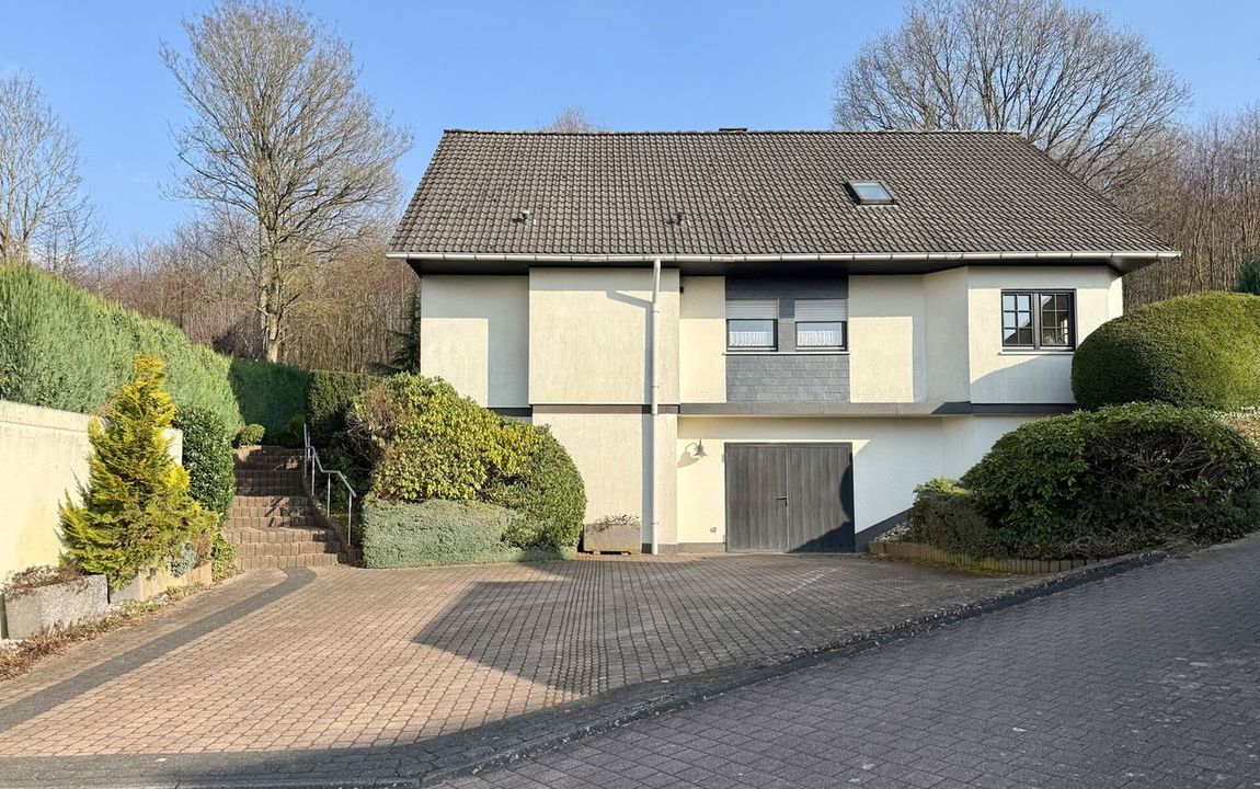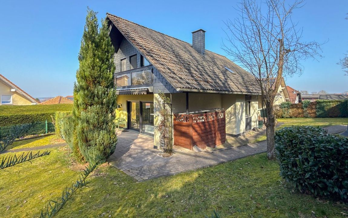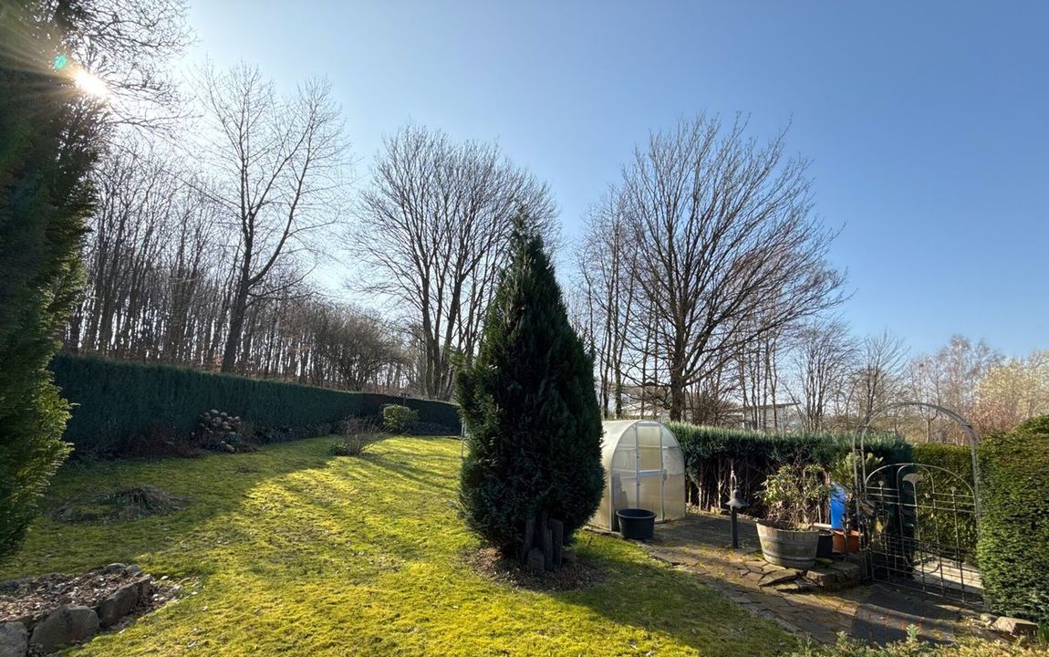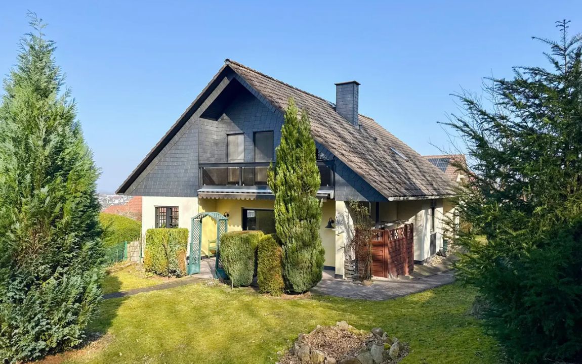Dieses gepflegte Einfamilienhaus aus dem Jahr 1986 bietet mit rund 160 m² Wohnfläche auf einem ca. 868 m² großen Grundstück vielseitige Möglichkeiten. Es handelt sich um ein Fingerhut-Fertighaus mit durchdachter Aufteilung und der Option, das DG als Einliegerwohnung zu nutzen. Die Lage in einem verkehrsberuhigten Bereich ist besonders attraktiv für Familien. Direkt angrenzend an den Waldrand genießen Sie hier Ruhe und ein angenehmes Wohnumfeld. Das EG ist altersgerecht gestaltet und überzeugt durch eine schöne, offene Raumaufteilung. Küche und Essbereich gehen harmonisch ineinander über und öffnen sich zum Wohnzimmer mit Kachelofen. Eine große Fensterfront, zur Südterrasse ausgerichtet, sorgt für viel Tageslicht. Ergänzt wird diese Ebene durch ein Gäste-WC und ein Schlafzimmer mit Bad – ideal für komfortables Wohnen auch im Alter. Im DG stehen zwei Schlafzimmer, ein Bad sowie eine Wohnküche zur Verfügung. Dieser Bereich eignet sich hervorragend für größere Kinder, Gäste oder als separater Wohnraum. Vom Balkon aus haben Sie einen tollen Blick auf das Grundstück. Das Haus ist massiv, vollunterkellert und bietet reichlich Platz für Hobby oder Werkstatt. Ein Gewächshaus, eine Einzelgarage sowie 3–4 Stellplätze runden das Angebot ab.