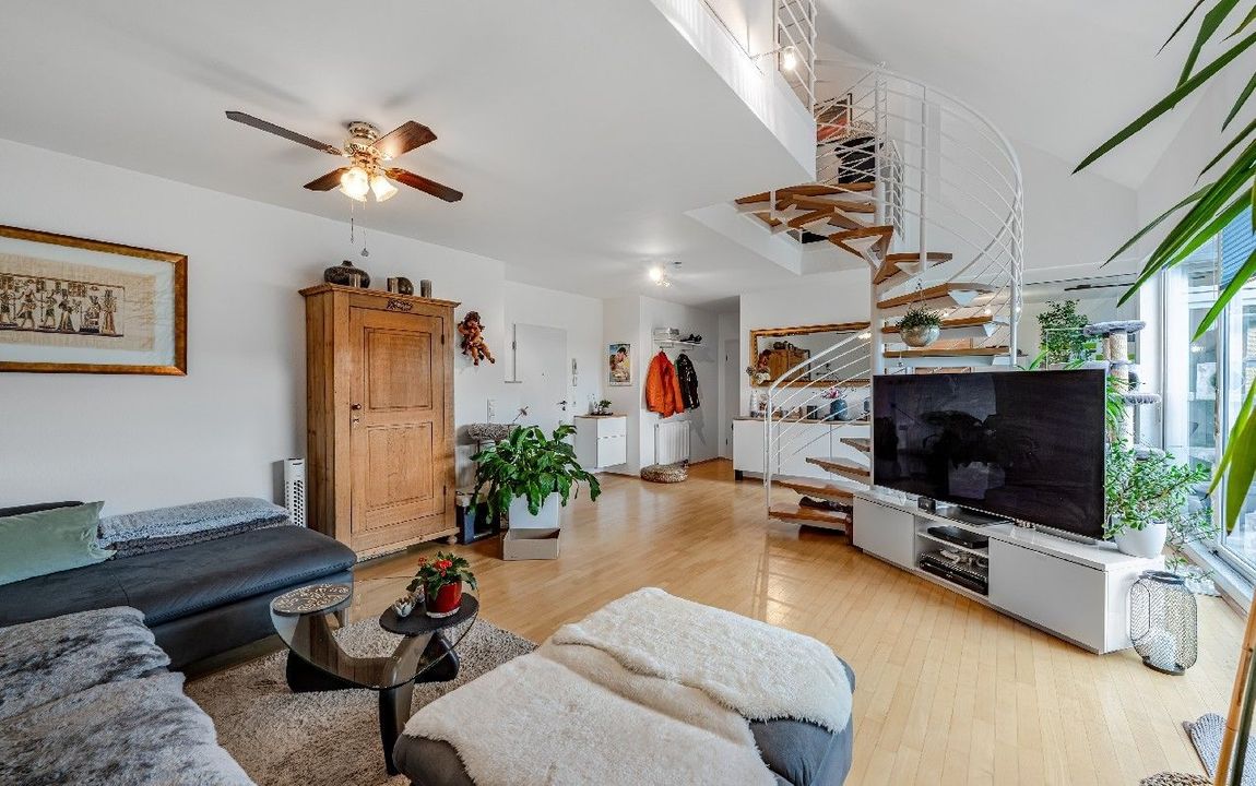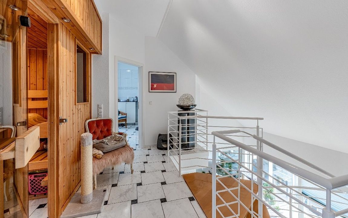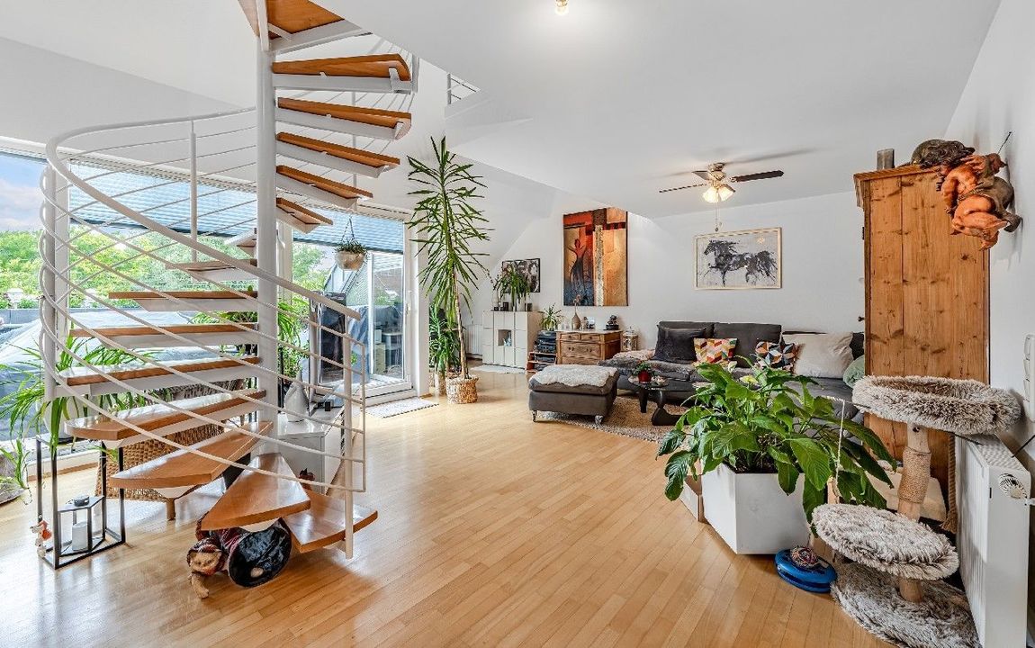 Eine filigrane Wendeltreppe führt ins Galeriegeschoss. Hier beeindruckt besonders der offene Galeriebereich mit Blick in das darunterliegende Geschoss die großzügige Deckenhöhe und der Lichteinfall schaffen ein luftiges, beinahe loftartiges Wohngefühl. Das Galeriegeschoss beherbergt ein geräumiges Elternschlafzimmer mit praktischen Einbauschränken sowie ein Tageslichtbad mit Dusche und Eckbadewanne. Ein weiterer, ursprünglich als Kinder- oder Gästezimmer geplanter Raum wird als private Sauna und Ruhezone genutzt. Ein Rückbau zur Nutzung als Büro oder Kinderzimmer ist auf Wunsch ohne großen Aufwand möglich. Von hier aus gelangen Sie direkt auf den zweiten, uneinsehbaren Balkon mit weitem Blick ins Grüne. Ein Rückzugsort mit echter Wellness-Qualität. Ein kleiner Abstellraum in der Dachschräge komplettiert die Wohneinheit.