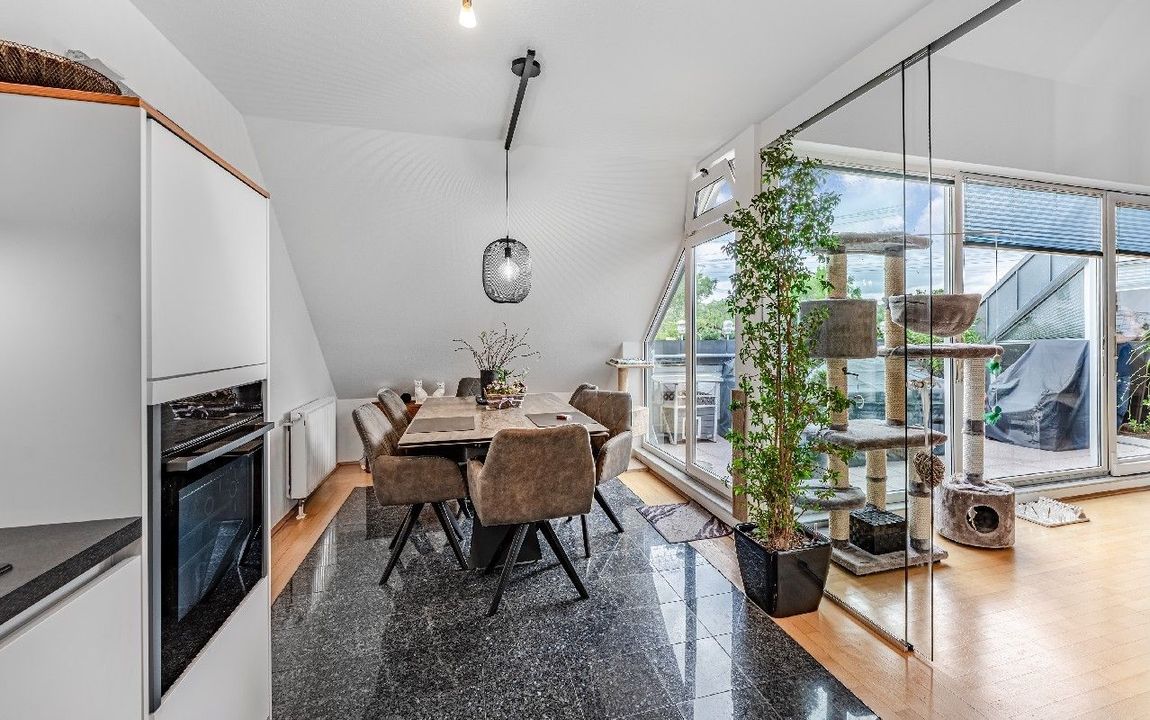 Diese Maisonette-Wohnung erstreckt sich über das 2. Obergeschoss sowie das ausgebaute Galeriegeschoss einer gepflegten Wohnanlage am Rande eines Naturschutzgebiets. Mit einer Wohnfläche von ca. 107 m², zwei Balkonen, einer beeindruckenden Raumhöhe durch die offene Galerie und einer hochwertigen Ausstattung bietet diese Immobilie außergewöhnlichen Wohnkomfort sowohl für Kapitalanleger als auch für Eigennutzer mit Anspruch. Der Zugang zur Wohnung erfolgt über das 2. Obergeschoss. Hier eröffnet sich ein großzügiger Wohnbereich mit Zugang zum großen Balkon in Westausrichtung. Über ein großes Schiebetürelement gelangen Sie ins Freie. Die Küche und der Essplatz sind durch eine elegante Glasschiebetür vom Wohnraum separiert. Die moderne Einbauküche wurde erst im vergangenen Jahr von
