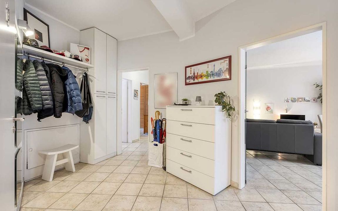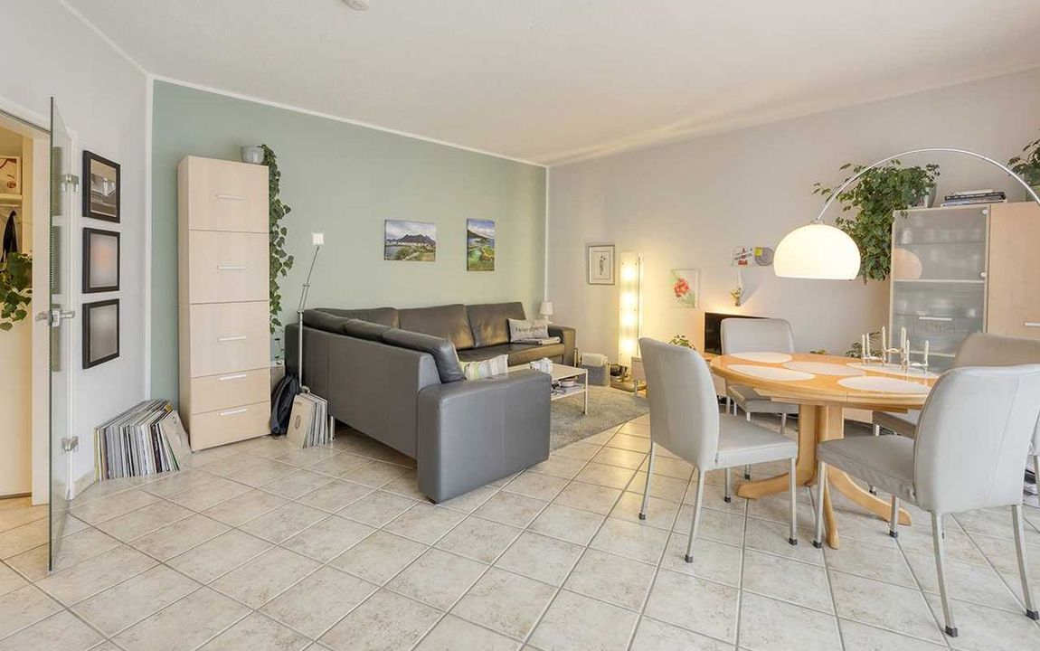 Von der zentralen Empfangsdiele aus gelangen Sie in das helle und gut geschnittene Wohnzimmer mit angrenzendem Balkon, die geräumige Küche und das Gäste-WC.
