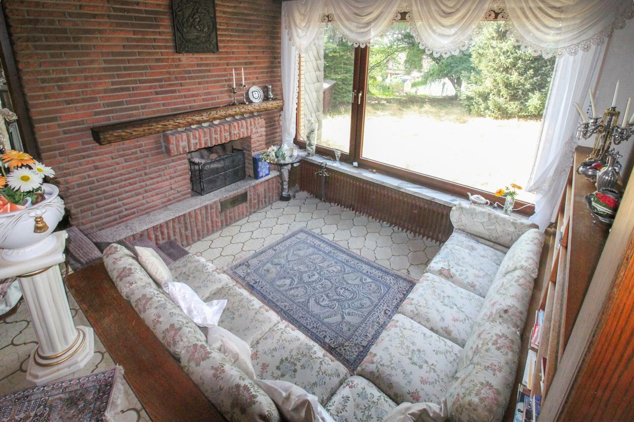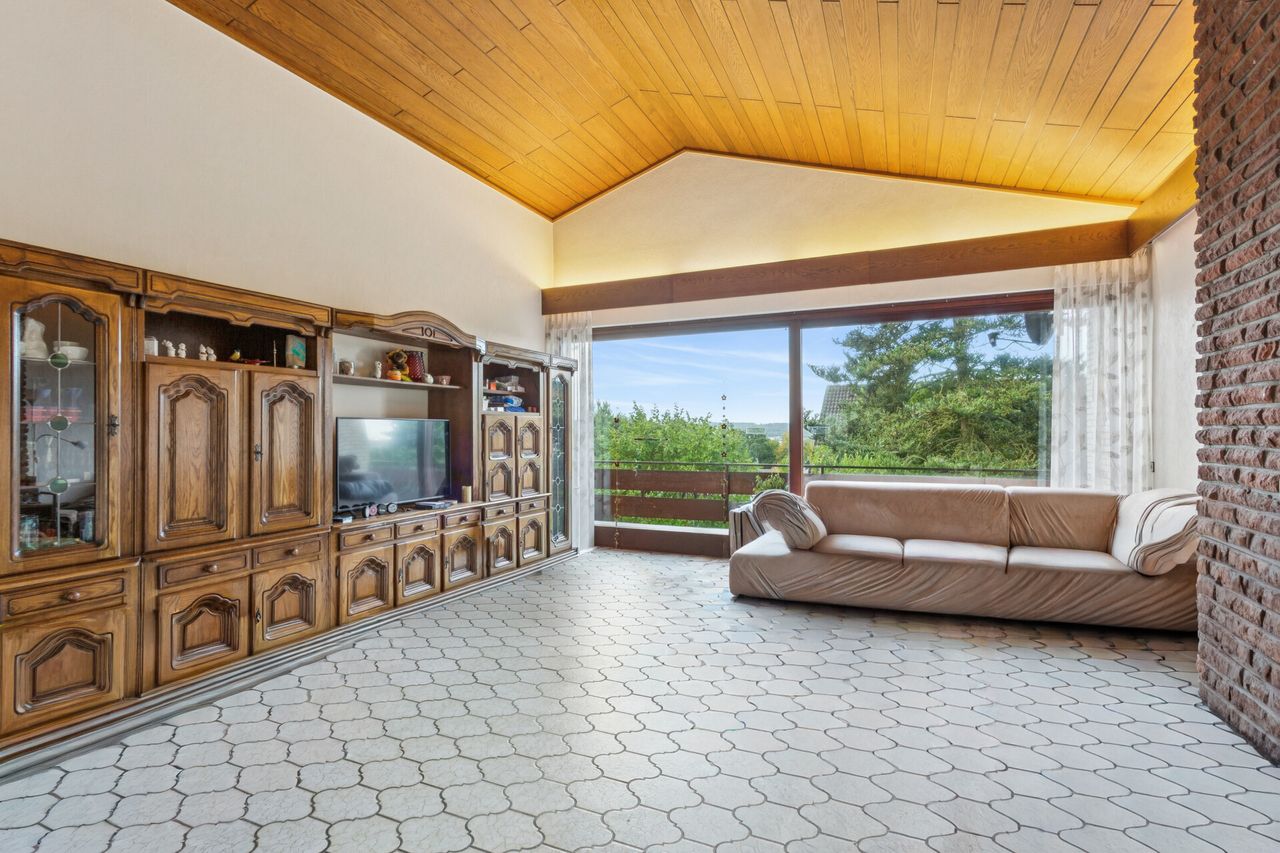 Beim Betreten des Erdgeschosses gelangt man über die Diele direkt in den offen gestalteten Wohn-, Küchen- und Essbereich, der dank hellen Fliesen und bodentiefer Fenster von Licht durchflutet wird und einen herrlichen Ausblick eröffnet. Die Holzbalken und Holzverkleideten Decken sorgen für ein Wohlfühlambiente. Im Wohnzimmer befindet sich außerdem eine großzügige Kaminecke, welche über drei Stufen erreicht werden kann und durch Fenster mit elektrischen Rollläden direkten Ausblick in den Garten bietet.