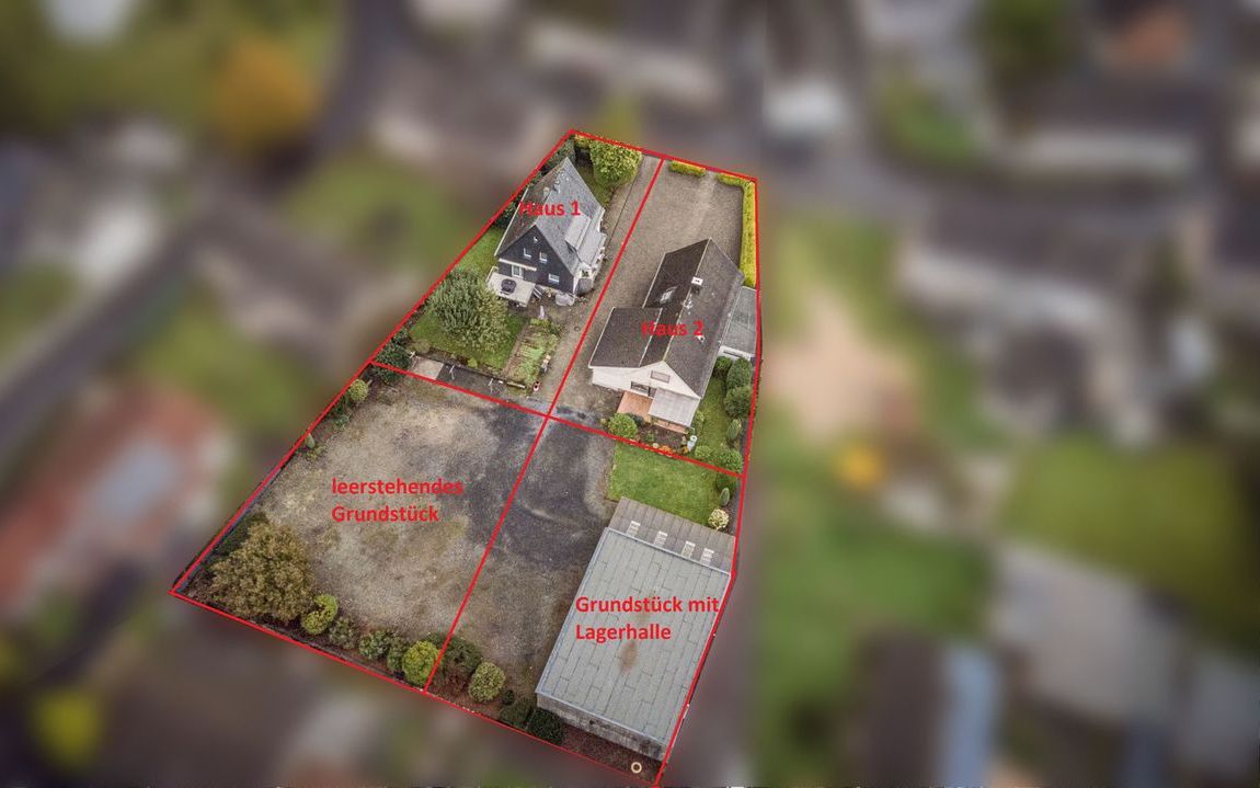 Die zwei hinteren Grundstücke, eines davon mit Lagerhalle, können eigenständig genutzt, bebaut oder