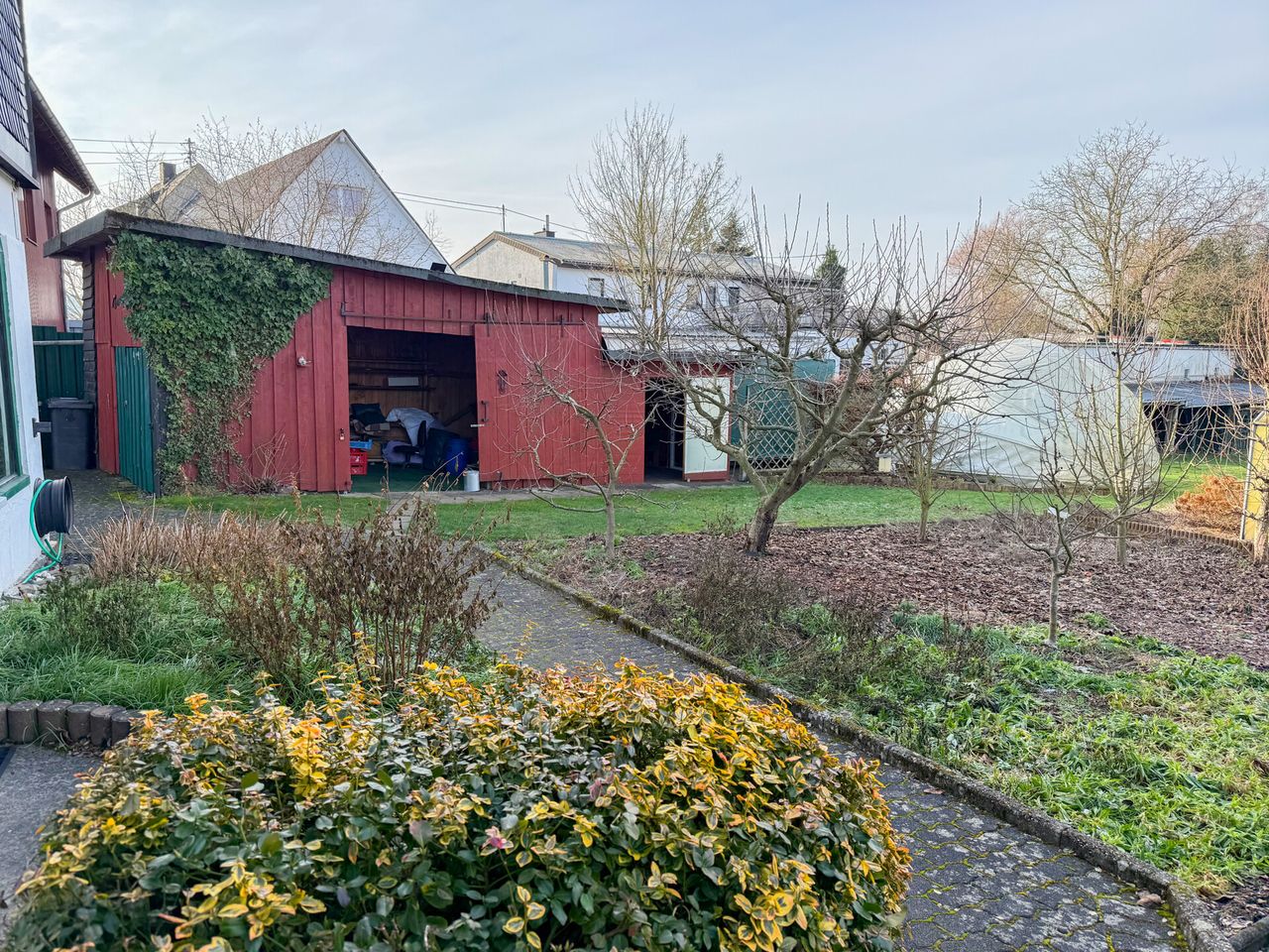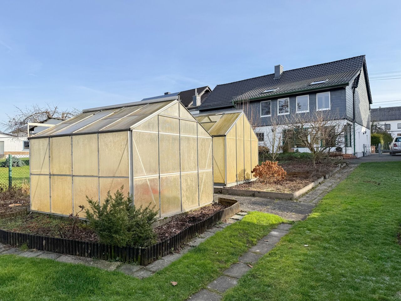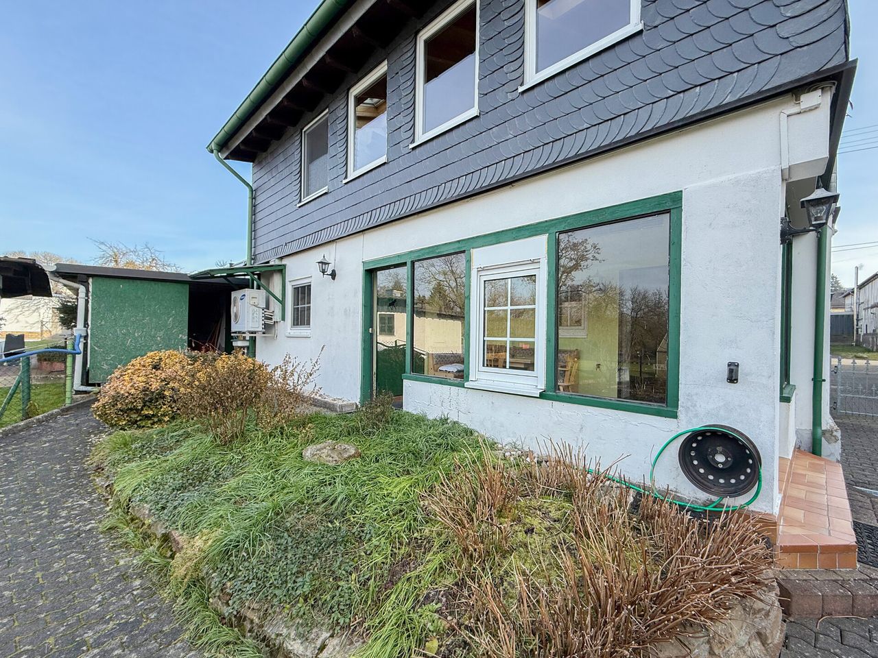 Auf dem großzügigen Grundstück von ca. 1.124 m² befinden sich zwei Einfamilienhäuser mit äußerst vielseitigen Nutzungsmöglichkeiten. Ob Wohnen & Arbeiten, Mehrgenerationenwohnen, Teilvermietung oder Kapitalanlage – nahezu alle Nutzungskonzepte sind denkbar. Besonders hervorzuheben ist der große Garten, der nach hinten an den Ortsrand grenzt. Das Vorderhaus (Haus 1) aus schätzungsweise 1900/10 verfügt über rund 130 m² Wohnfläche, ist voll unterkellert und das Dachgeschoss ist ausgebaut. Durch den vorhandenen Vorder- und Hintereingang sowie den Grundriss ist eine Aufteilung in zwei Einheiten möglich; zwei separate Stromzähler sind bereits vorhanden. Die ehem. Scheune (heute Haus 2), wurde 1991 zum heutigen Wohnhaus umgebaut, liegt in zweiter Baureihe und grenzt direkt an das Gartengrundstück. Im Erdgeschoss befinden sich Heizung, Garage sowie ein verglaster Sitzbereich mit Sommerküche. Die Wohnräume liegen im Obergeschoss. Der Speicher bietet zusätzliches Ausbaupotenzial. Das Grundstück überzeugt mit zahlreichen Sitzplätzen, zwei Gewächshäusern, Beeten, Pool mit Filteranlage, Regenwassertanks, Teich sowie mehreren Schuppen- und Werkstattbereichen und bietet insgesamt viel Platz für unterschiedlichste Bedürfnisse.